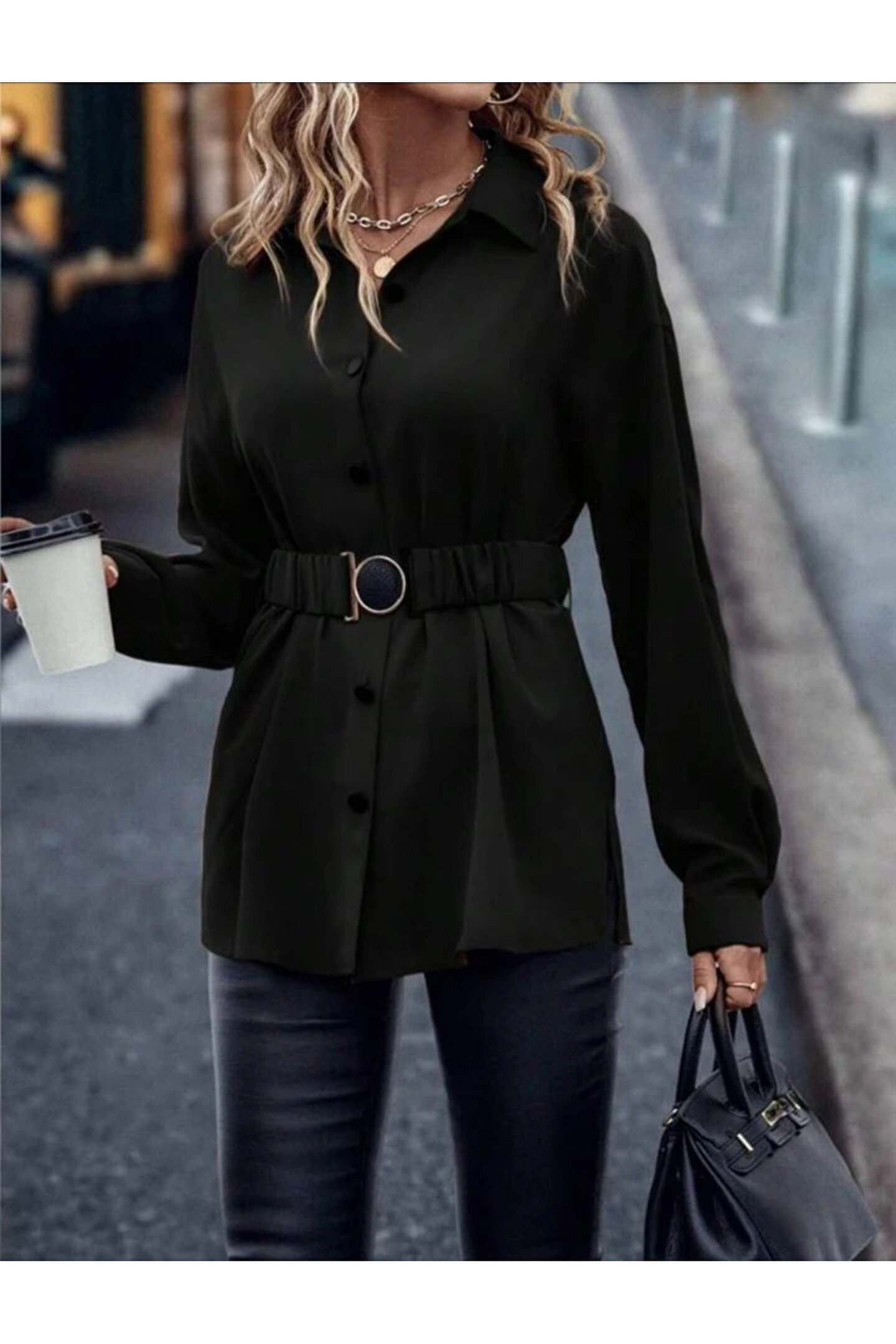 Kadın Uzun Kollu Yakalı önden Düğmeli Belden Kemerli Ithal Krep Bluz