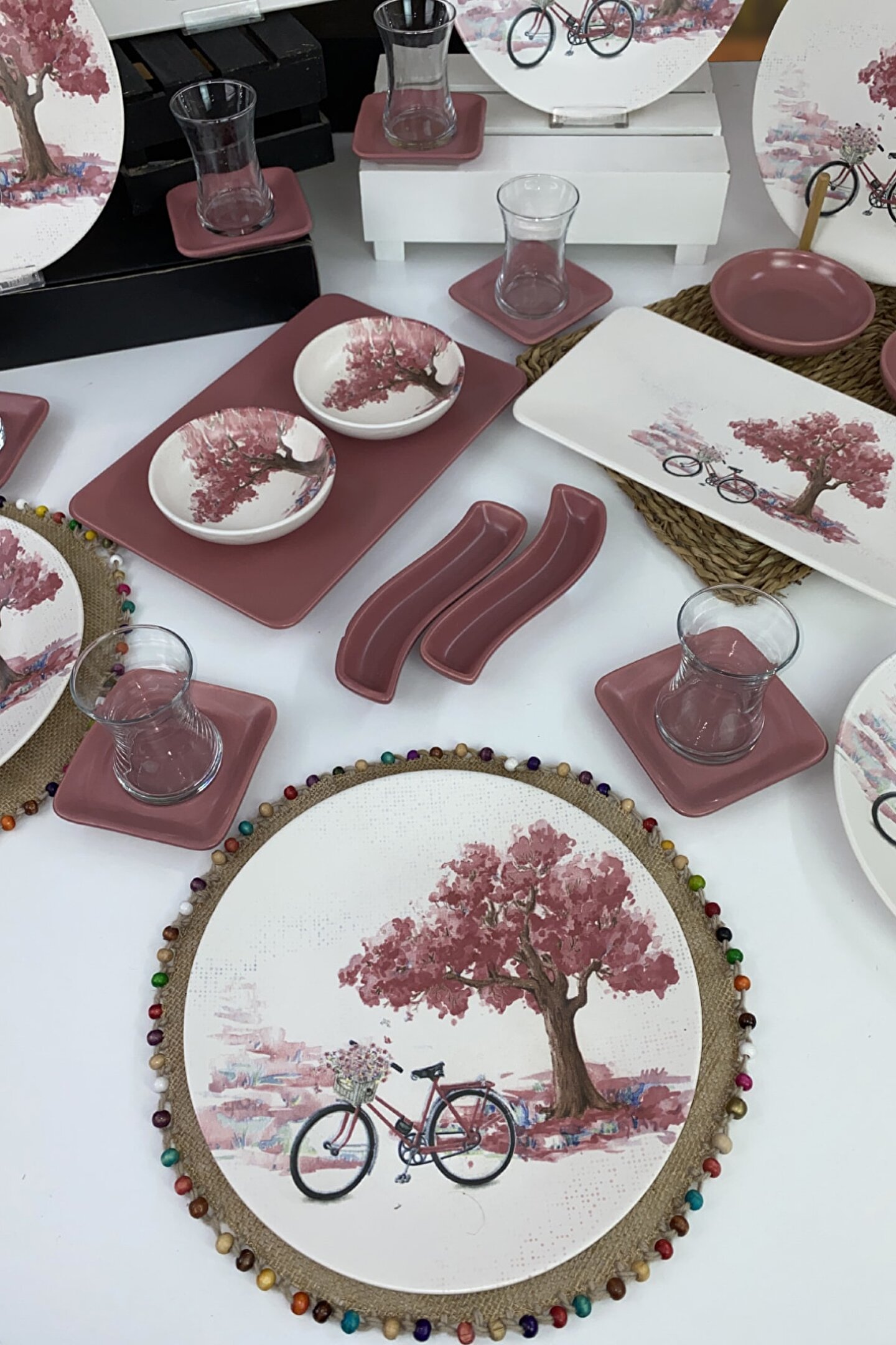 6 adet desenli 25cm servis tabağı. ; 6 adet gül kurusu kare çay tabağı. ; 6 adet cam çay bardağı. ; 2 adet gül kurusu 13cm halka kahvaltılık. ; 2 adet desenli 13cm halka kahvaltılık. ; 2 adet gül kurusu ivory zeytinlik. ; 2 adet desenli 33*17cm kayık tabak. ; 1 adet gül kurusu 31*21cm kayık tabak. ; Ürün kullanımı: Renkleri ve baskısı solmaz. ; Kolay temizlenir, mikrop barındırmaz. ; Bulaşık makinesi normal ayarında yıkanabilir. ; Tamamen sağlıklı ve ekolojik malzeme yapısına sahiptir. ; Türkiye’de üretilmiştir. ; Almış olduğunuz bu üründe kırık ürün değişim garantisi bulunmaktadır. Koli içerisinde bilgilendirme broşürü yer almaktadır. ; Taşıma esnasında kırılma riskine karşı güvenli paketleme yapılarak gönderimi sağlanmaktadır. ;