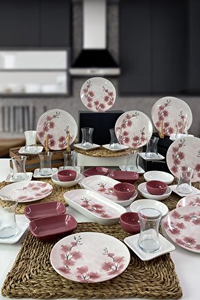 12 adet 20cm desenli kahvaltı tabağı ; 12 adet cam çay bardağı ; 12 adet beyaz çay tabağı ; 4 adet 13cm beyaz yuvarlak kahvaltılık ; 4 adet 8cm frambuaz yuvarlak kahvaltılık ; 4 adet 13cm frambuaz dikdörtgen kahvaltılık ; 2 adet 26cm desenli kayık tabak ; Ürün kullanımı: Renkleri ve baskısı solmaz.; Kolay temizlenir, mikrop barındırmaz.; ; Bulaşık makinesi normal ayarında yıkanabilir.; ; Tamamen sağlıklı ve ekolojik malzeme yapısına sahiptir.; ; Türkiye’de üretilmiştir.; ; Almış olduğunuz bu üründe kırık ürün değişim garantisi bulunmaktadır.; Koli içerisinde bilgilendirme broşürü yer almaktadır.; ; Taşıma esnasında kırılma riskine karşı güvenli paketleme yapılarak gönderimi sağlanmaktadır.; ; Koli ölçüleri : 36x36x34cm ; Koli Ağırlık: 12KG ;