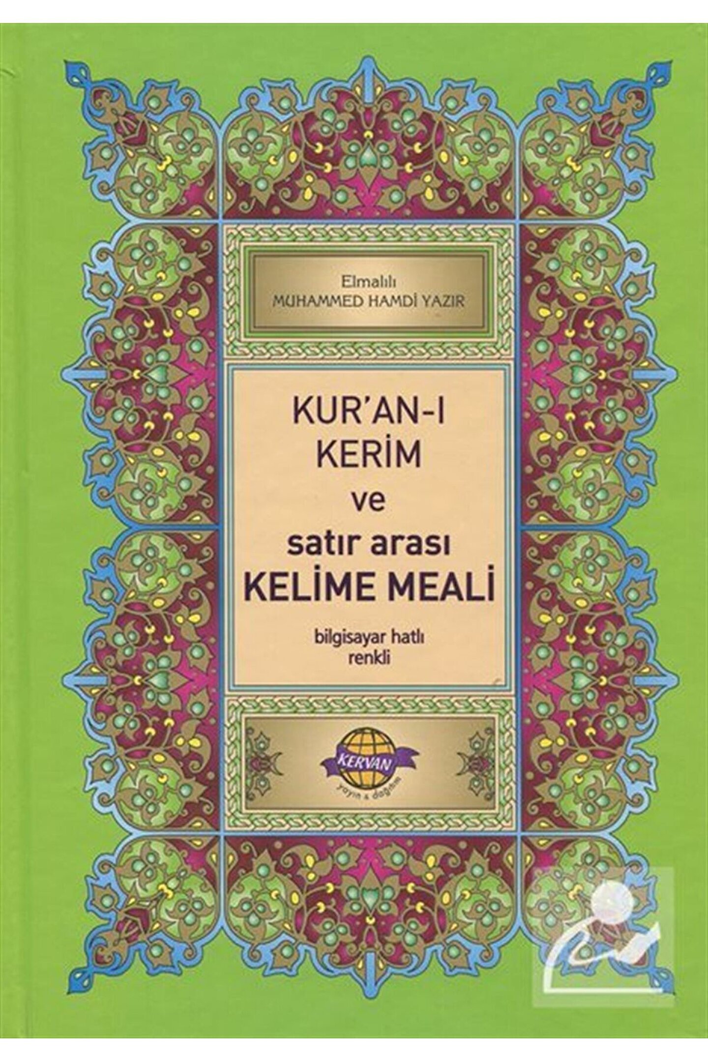 Kur'an-ı Kerim ve Satır Arası Kelime Meali Açıklamalı (Orta Boy) Kolektif, Elmalılı Hamdi Yazır / Kervan Yayın Dağıtm Basım Yılı: 2015; Sayfa Sayısı: 616; Kağıt Türü: Şamuha Kağıt; Ebat: 17 x 24; Dil: Arapça, Türkçe; Cilt Durumu: Ciltli; ISBN: 9789758896158; Renk: Renkli; Hazırlayan: Kolektif, Elmalılı Hamdi Yazır; Sadeleştiren: Yusuf Ertuğrul, Fahri Altunkaynak, A.; Cevad Karaman, Ahmet Öncel, Yasir Ünlü; Allah'u Tealanın Tevfik ve inayeti ile hazırladığımız bu Kur'ân-ı Kerim ve Türkçe Meali, dört değişik şekilde okunacak durumda hazırlanmıştır: a.; Kur'ân-ı Kerimi Arapça lafzı ile okumak.; b.; Yalnız Kur'ân'ın mealini okumak.; c.; Arapça lafzı ile beraber mealini okumak.; d.; Lafız ve meal kelime olarak aynı renkle renklendirildiğinden kelimenin lügat manasını anlayarak okumak.