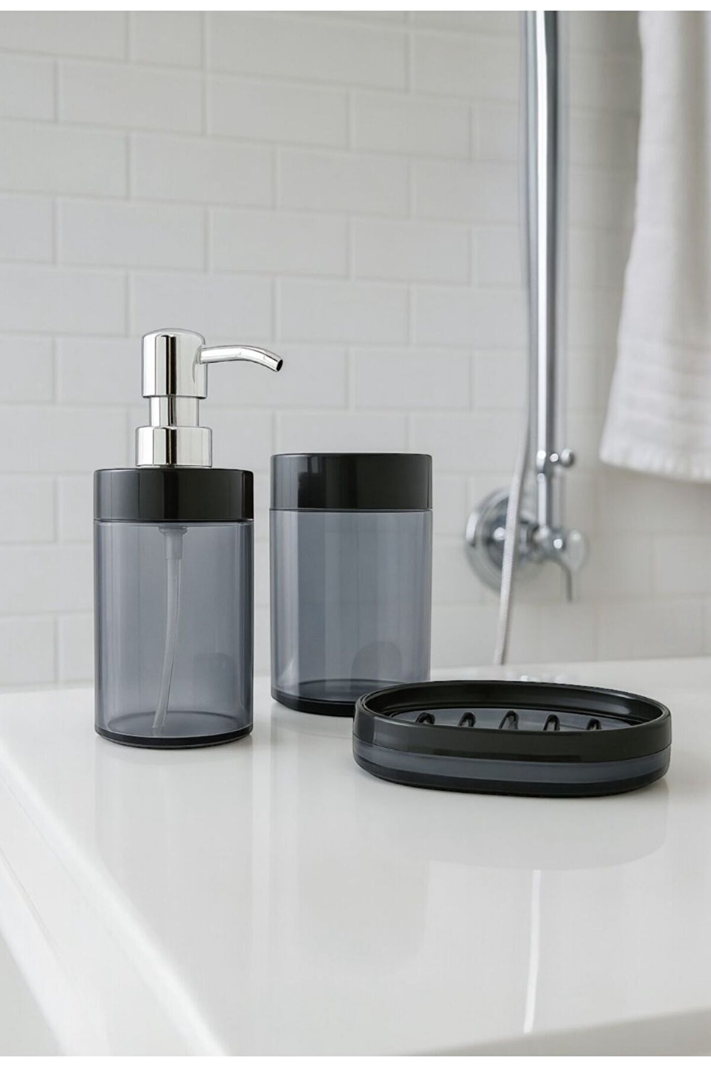 Modern ve şık bir görünüm sunan bu 3 parçalı siyah banyo seti, sade tasarımı ve koyu tonlarıyla banyonuza sofistike bir hava katar. Set içerisinde 1 adet sıvı sabunluk (krom görünümlü plastik başlık), 1 adet diş fırçalık ve 1 adet sabunluk bulunur. Şeffaf koyu gri gövdeye sahip bu ürünler, siyah kapak detaylarıyla tamamlanmıştır. Sıvı sabunluk, pas yapmayan ve metal görünümü veren plastik pompasıyla uzun ömürlü ve kullanışlıdır. Diş fırçalık, fırçalarınızı ve macunlarınızı düzenli tutar. Sabunluk, iç kısmındaki kanallarla sabunun kuru kalmasını sağlar. Hafif ve dayanıklı plastik malzeme sayesinde hem ev hem otel gibi alanlarda ideal bir kullanım sunar. Malzeme: %100 plastik (ABS ve akrilik). Renk: Siyah - Şeffaf Gri. Kullanım alanları: Ev banyosu, duş alanı, otel, ofis lavabosu, öğrenci evleri ve yurtlar.