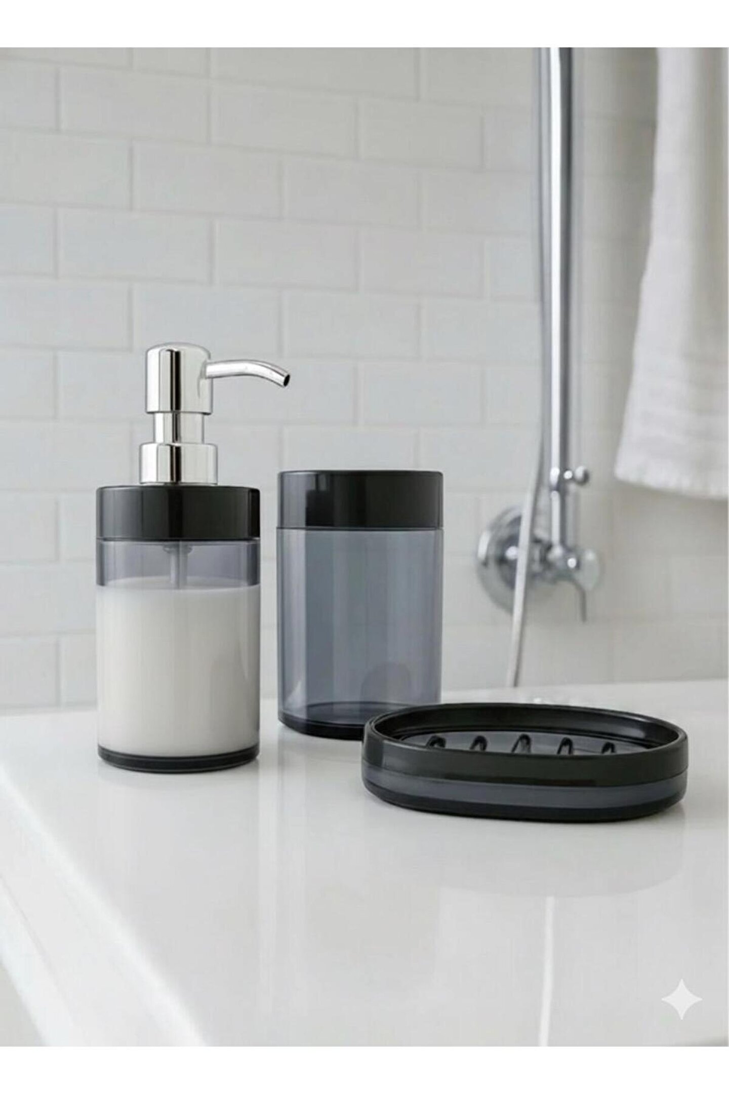 Modern ve şık bir görünüm sunan bu 3 parçalı siyah banyo seti, sade tasarımı ve koyu tonlarıyla banyonuza sofistike bir hava katar. Set içerisinde 1 adet sıvı sabunluk (krom görünümlü plastik başlık), 1 adet diş fırçalık ve 1 adet sabunluk bulunur. Şeffaf koyu gri gövdeye sahip bu ürünler, siyah kapak detaylarıyla tamamlanmıştır. Sıvı sabunluk, pas yapmayan ve metal görünümü veren plastik pompasıyla uzun ömürlü ve kullanışlıdır. Diş fırçalık, fırçalarınızı ve macunlarınızı düzenli tutar. Sabunluk, iç kısmındaki kanallarla sabunun kuru kalmasını sağlar. Hafif ve dayanıklı plastik malzeme sayesinde hem ev hem otel gibi alanlarda ideal bir kullanım sunar. Malzeme: %100 plastik (ABS ve akrilik). Renk: Siyah - Şeffaf Gri. Kullanım alanları: Ev banyosu, duş alanı, otel, ofis lavabosu, öğrenci evleri ve yurtlar.