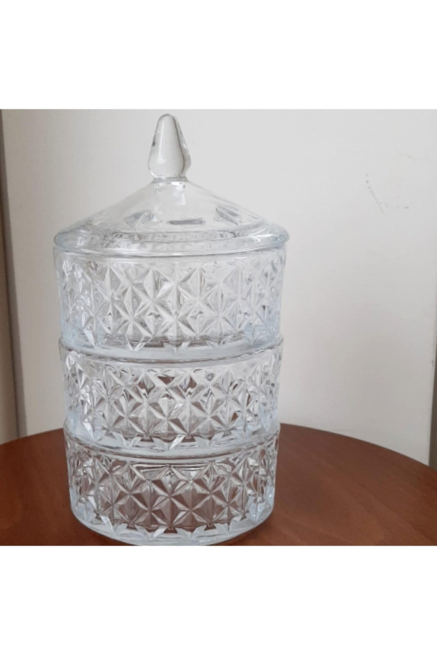 ART 1 ADET 3 KATLI CAM KAPAKLI ŞEKERLİK - BAHARATLIK - KAVANOZ - KURABİYELİK - ÇEREZLİK - SUNUMLUK Ölçüler :Yükseklik 23 cm X Çap 12,5 cm