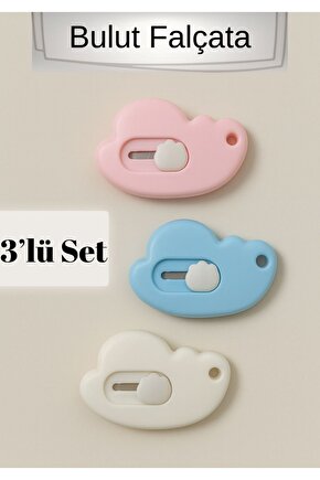 Bulut şeklindeki tasarımıyla eğlenceli bir görünüm sunan 3’lü falçata seti, farklı renk seçenekleriyle her kullanım alanına uyum sağlar.; Kompakt boyutuyla çantanızda, kalemlikte veya ofis çekmecenizde rahatça saklanabilir.; Kağıt, ambalaj ve paketleri hızlıca açmak için idealdir.; Kayar güvenlik mekanizmasıyla hem şık hem güvenli bir kullanım sunar.; Hem kendiniz hem de sevdikleriniz için şirin ve işlevsel bir settir.; ; STOK DURUMUNA GÖRE RENK GÖNDERİLİR
