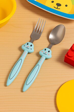 Sevimli tavşan figürlü mavi sap tasarımıyla çocukların ilgisini çeken bu çatal kaşık seti, ergonomik yapısıyla küçük eller için kolay kullanım sağlar.; Paslanmaz çelik uçlarıyla güvenli ve dayanıklıdır.; Renkli ve eğlenceli tasarımı sayesinde yemek saatlerini keyifli hale getirir.