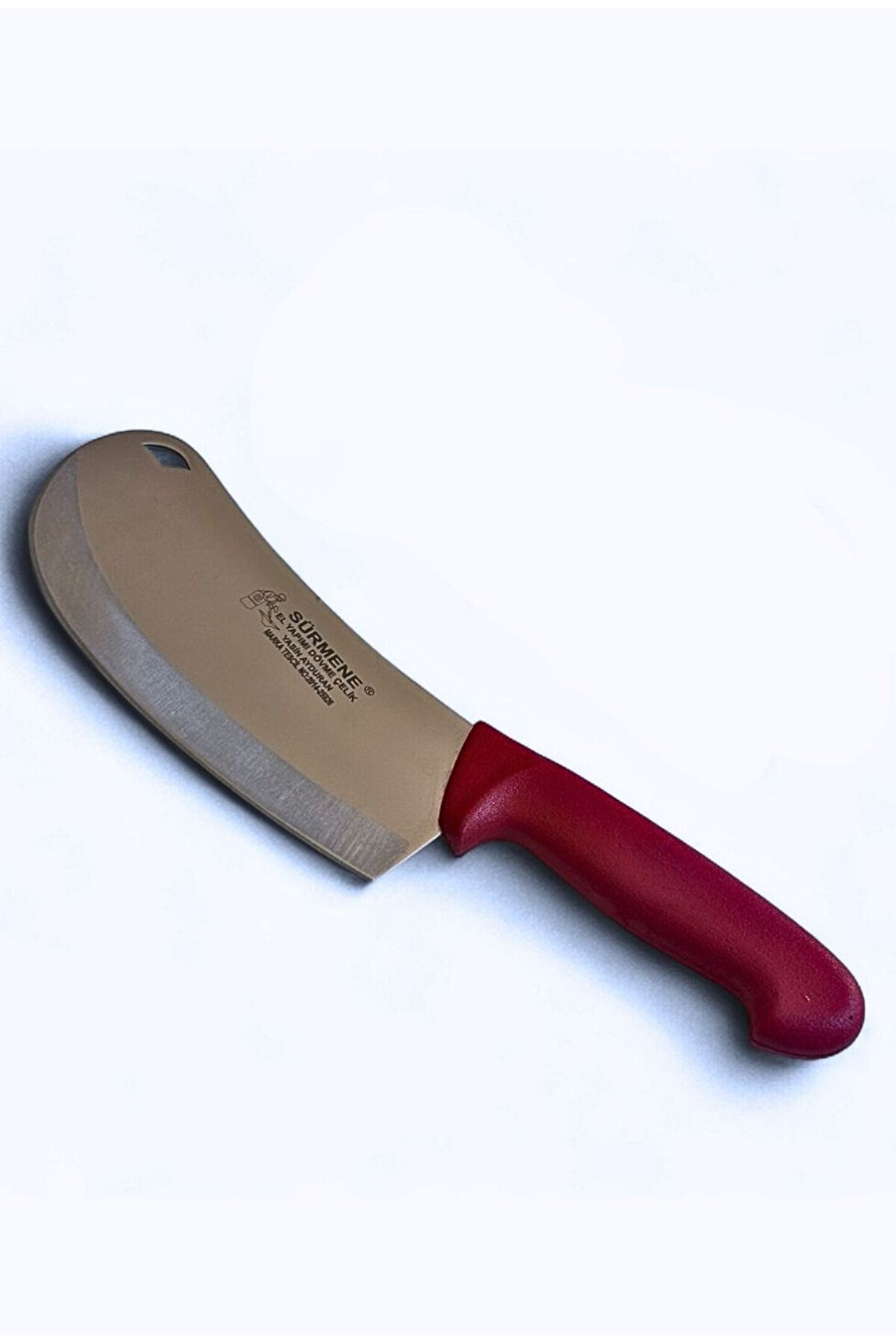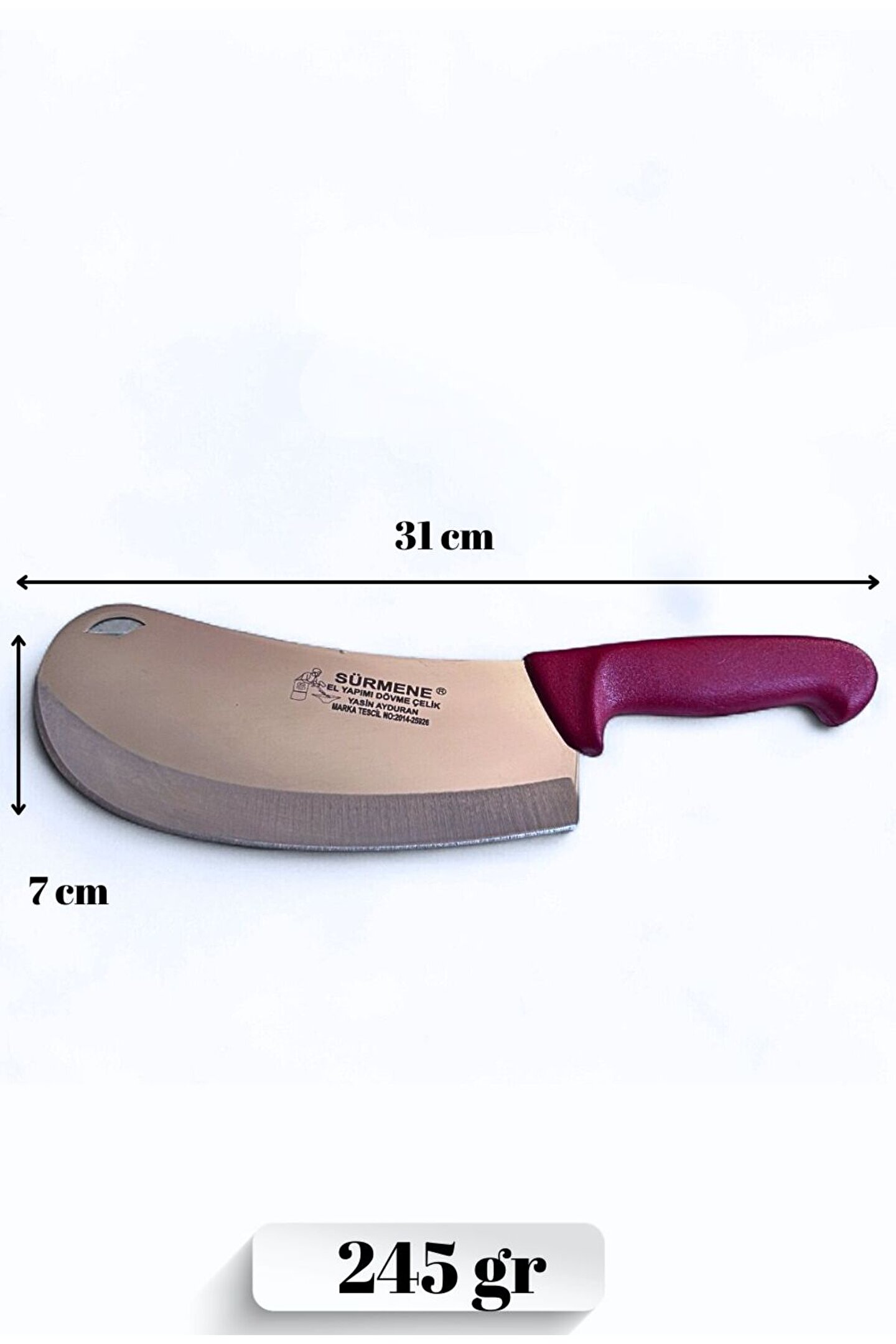 Geleneksel Sürmene ustalığıyla el işçiliğiyle üretilen Sürmene El Yapımı Dövme Çelik Kasap Bıçağı, profesyonel kasaplar ve mutfakta yüksek isteyen kullanıcılar için tasarlanmıştır.; Dayanıklı dövme çelik yapısı sayesinde uzun ömürlüdür ve zorlayıcı et doğrama işlemlerinde bile üstün sunar.; Ergonomik tasarımlı kırmızı sapı, elden kaymayı önler ve uzun süreli kullanımlarda bile rahat bir tutuş sağlar.; Geniş ve kıvrımlı ağız yapısı, özellikle et parçalama, kıyma hazırlama ve büyük parça doğrama gibi işlemler için idealdir.; ✔️ Ürün Özellikleri: • El yapımı dövme çelik: Uzun ömürlü, sağlam ve paslanmaya karşı dayanıklı • Geniş ve kavisli bıçak yapısı: Et doğrama, parçalama ve işleme için mükemmel • Ergonomik sap: Rahat ve güvenli kullanım • Profesyonel kasaplar ve mutfakta yüksek isteyen kullanıcılar için uygundur • Kolay bileme özelliği ile uzun süre keskinliğini korur