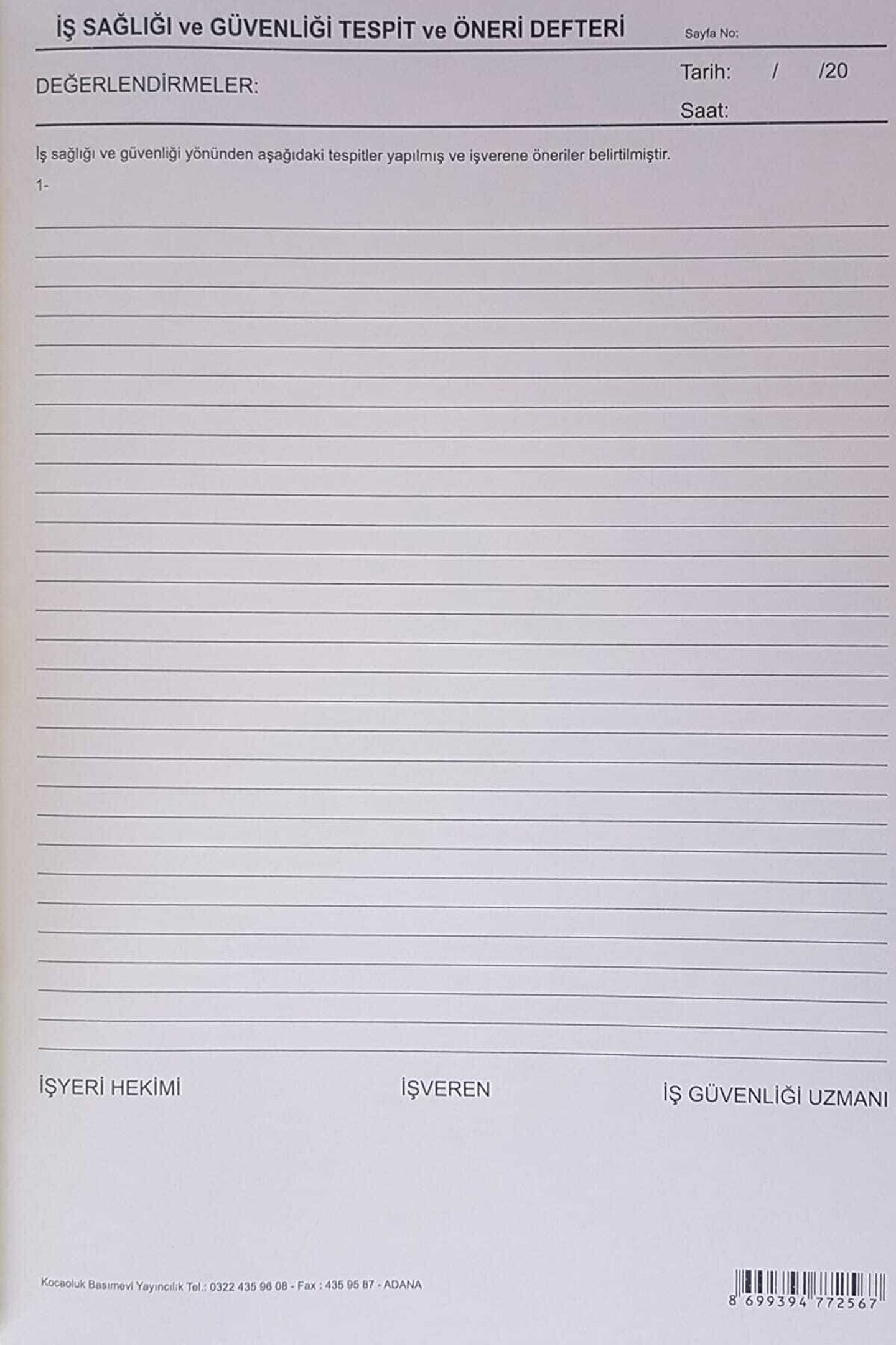 Kocaoluk cilt kapak iş sağlığı ve güvenliği tespit ve öneri defeteri 90 yaprak (3x30 otokopili)