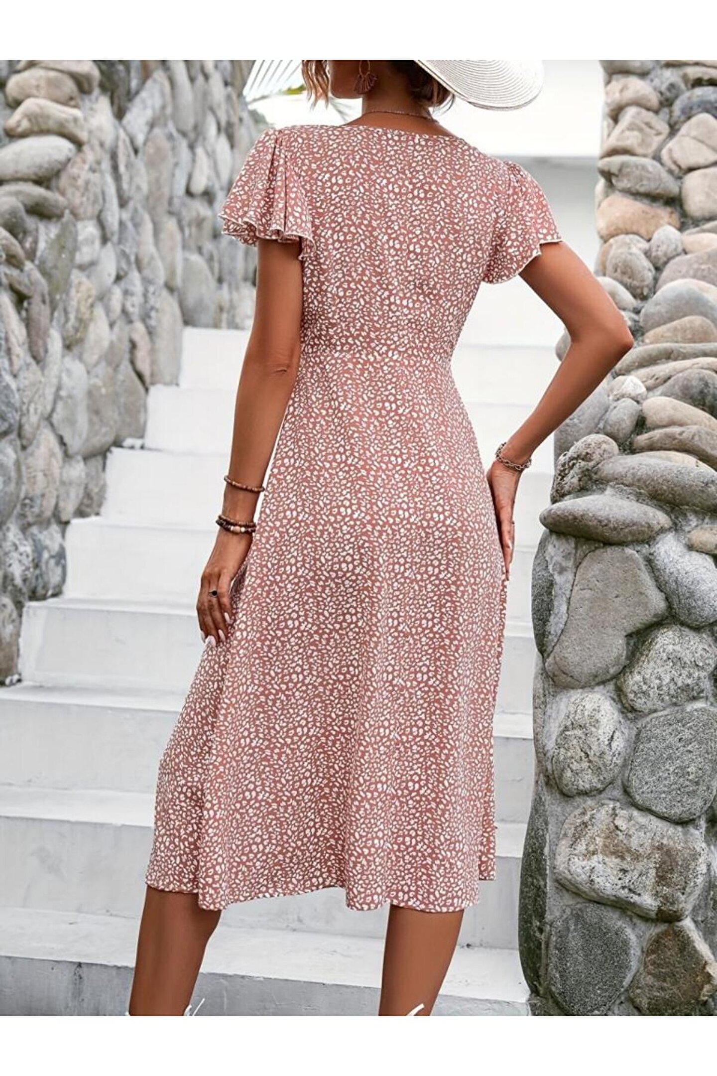 KOZMERA BUTİK Kadın Kısa Kollu önü Düğmeli Volanlı Minik Leopar Desen Midi Viskon Elbise