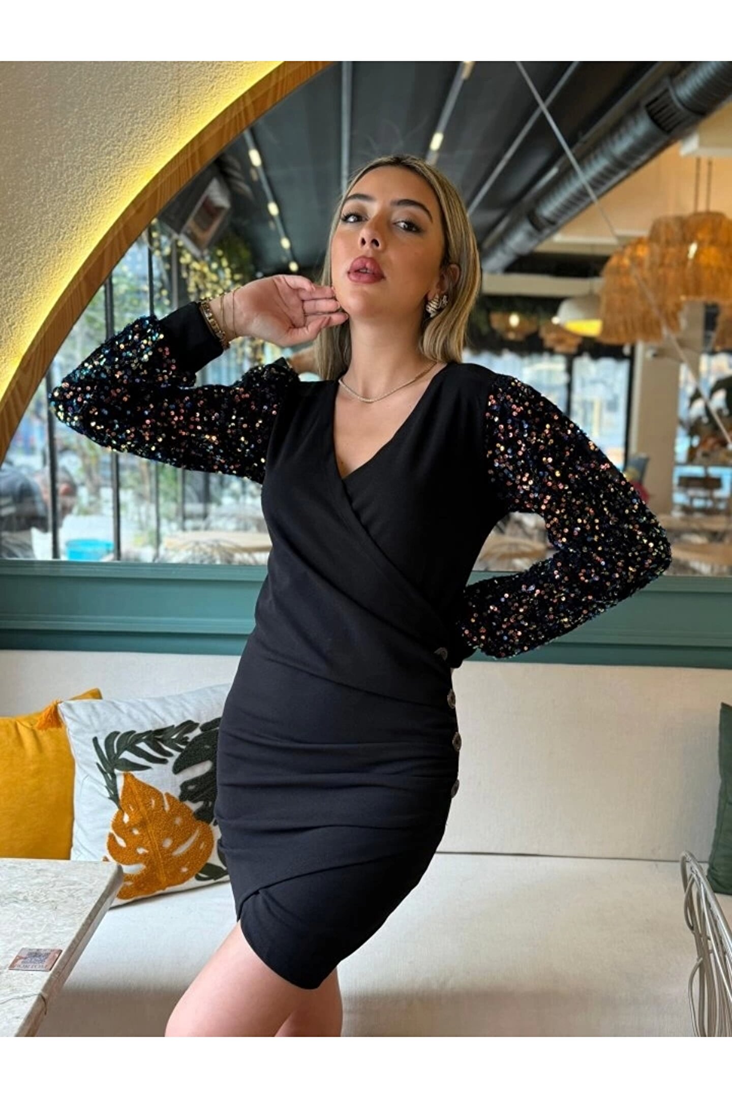 Kadın Uzun Kollu Pul Payetli Kruvaze Yaka Yandan Düğmeli Kısa Ithal Krep Elbise Aynı gün içerisinde kargo da siparişleriniz olacaktır.