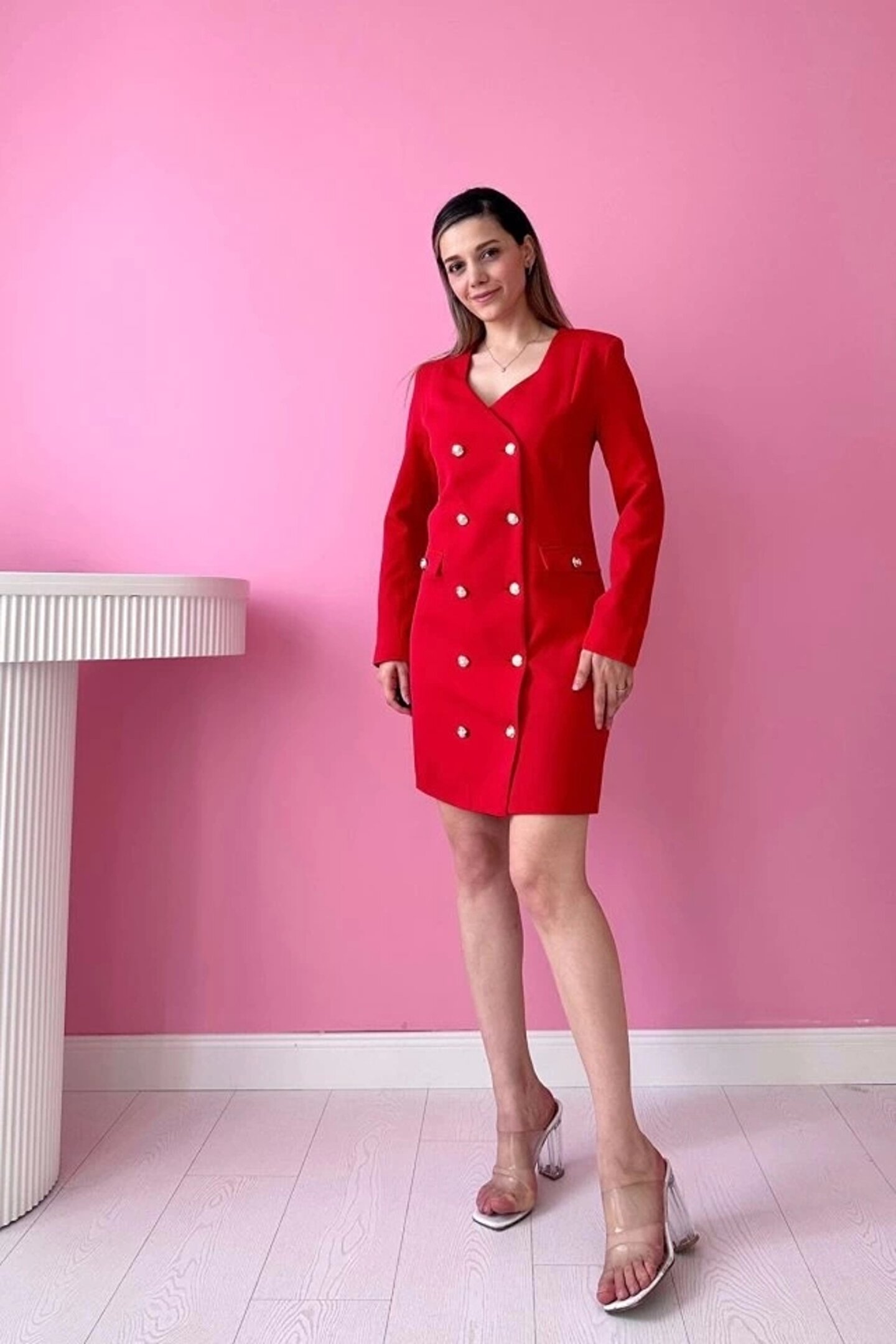 KOZMERA BUTİK Kırmızı Gold Düğmeli Ceket Elbise