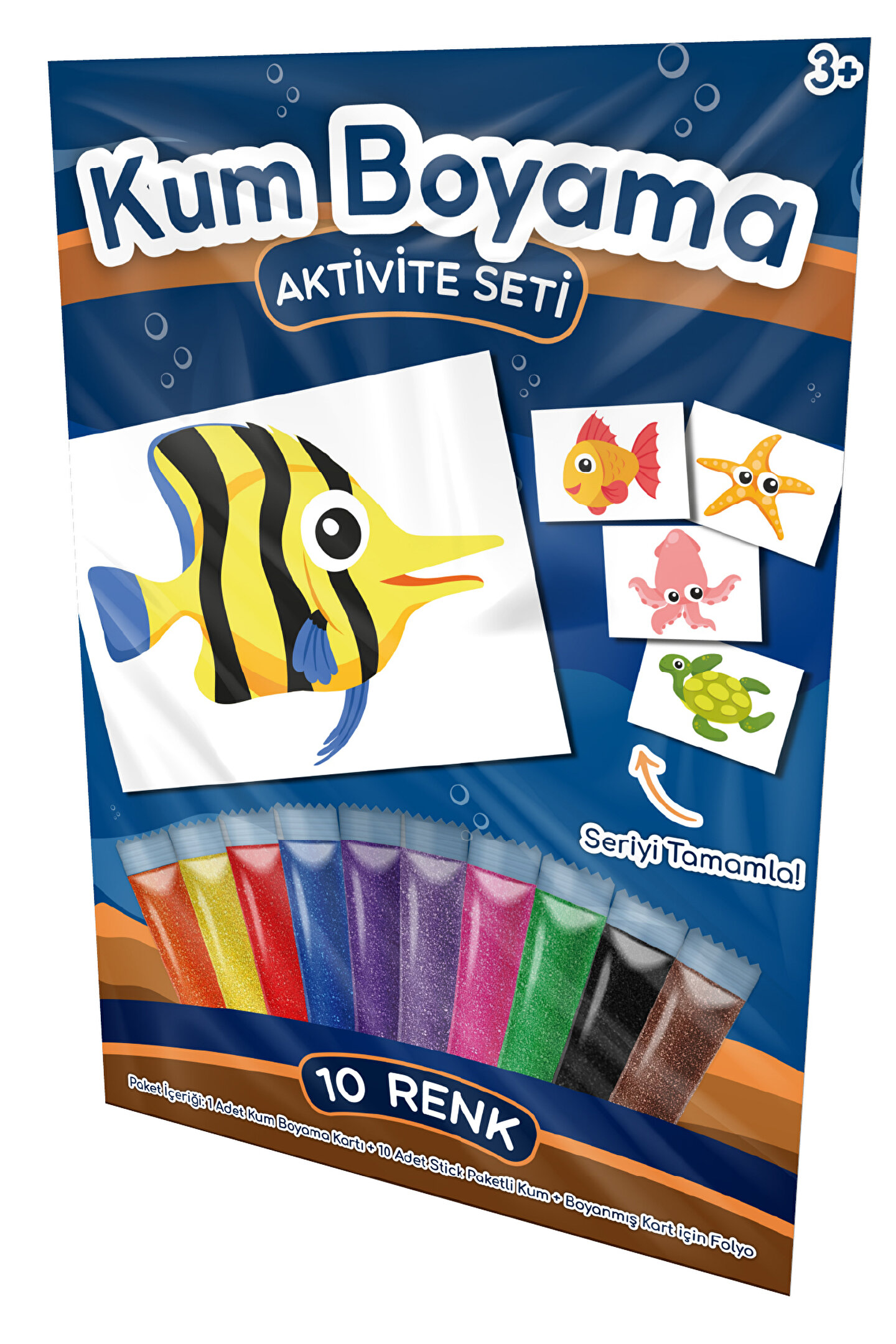 3 yaş ve üzeri çocuklar için ideal, eğlenceli ve eğitici bir aktivite seti; Renkli çizgili balıklarla dolu bu boyama kitabı, çocukların yaratıcılıklarını geliştirmelerine yardımcı olur; Kum boyama aktivitesi sayesinde çocuklar, renkleri karıştırarak ve farklı dokular oluşturarak motor becerilerini geliştirir; Ebeveynler için de kolay temizlenebilir ve tekrar kullanılabilir olması, uzun süreli eğlence sağlar;
