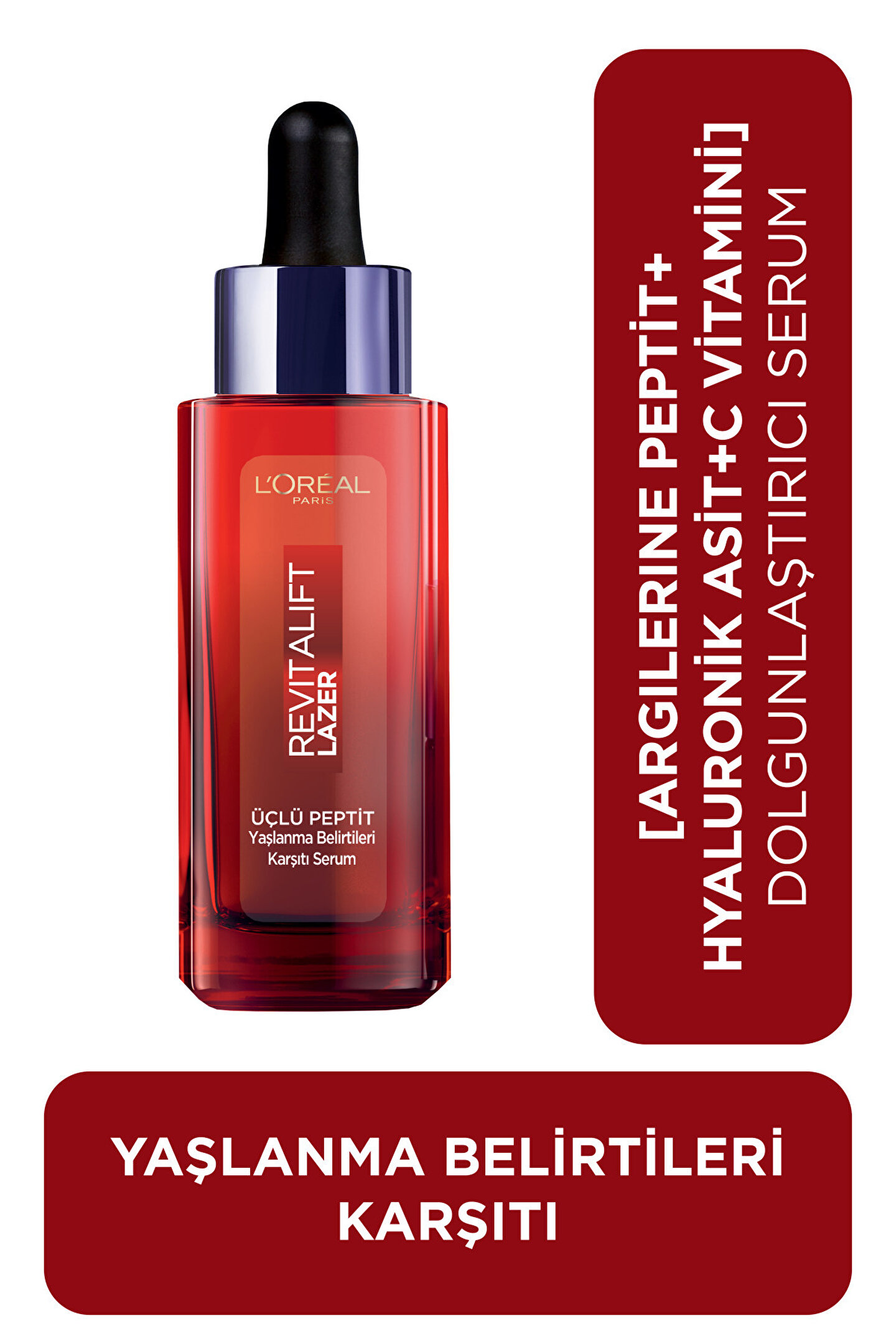 3 SERUMUN FAYDASI 1 ŞİŞEDE Kırışıklık görünümü, sıkılık kaybı ve eşit olmayan cilt tonundan mı şikayetçisiniz? Revitalift Lazer Üçlü Peptit Yaşlanma Belirtileri Karşıtı Serum, yaşlanma belirtileri karşıtı sonuçlar için 3 serumun faydasını 1 şişede birleştiriyor.ETKİLİ AKTİF İÇERİKLERLE GÜÇLENDİRİLMİŞ FORMÜL1. PEPTiTLER Argireline®*** PeptidiKırışıklık görünümünü pürüzsüzleştirmeye yardımcı olur. Kolajen Peptit Parçaları Ciltte sıkılaşmış his bırakmaya yardımcı olur. Elasti-Peptitler Cildin elastikiyetini arttırmaya yardımcı olur. 2. HYALURONİK ASİTMakro ve Mikro Hyaluronik Asitler cildi yoğun şekilde nemlendirip dolgunlaştırmaya yardımcı olur. 3. C VİTAMİNİ*Cildin parlak görünüm kazanmasına ve cilt tonunun eşitlenmesine yardımcı olur.2 haftada gözle görülür sonuçlar.** • Kırışıklık görünümünü azaltır• • Cildi aydınlatır*Cg Vitamini **Kişisel değerlendirme, 76 kişi, 2 hafta ***Argireline®, Lubrizol Advanced Materials Inc. veya bağlı kuruluşları tarafından tescilli bir bileşimdir