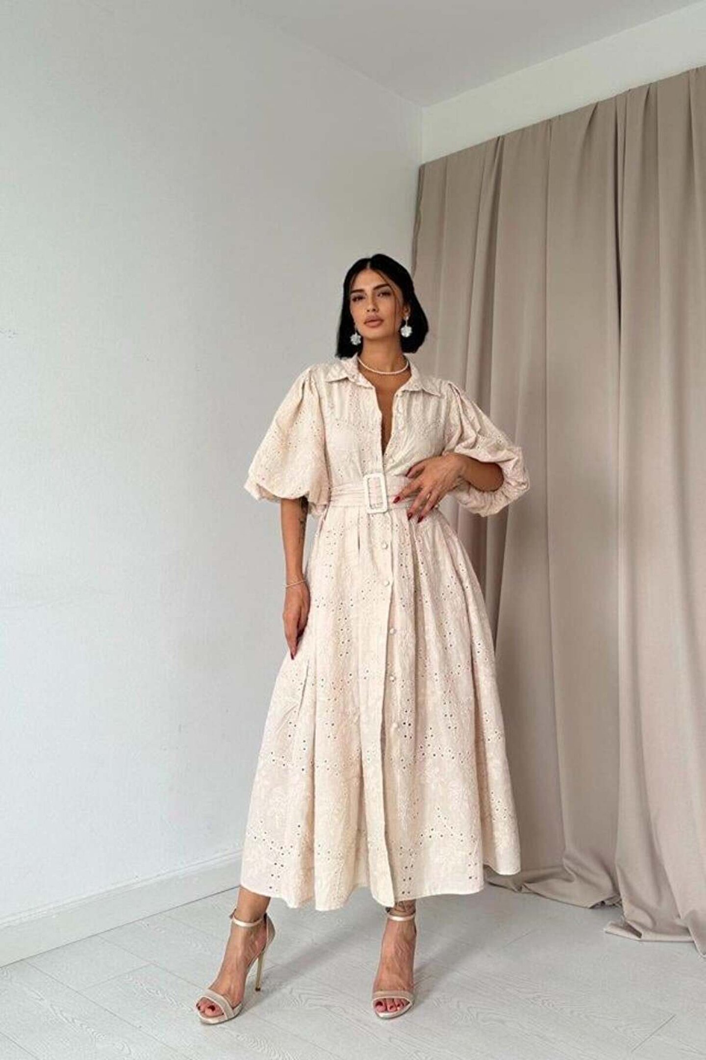 Bej Pileli Balkon Elbise