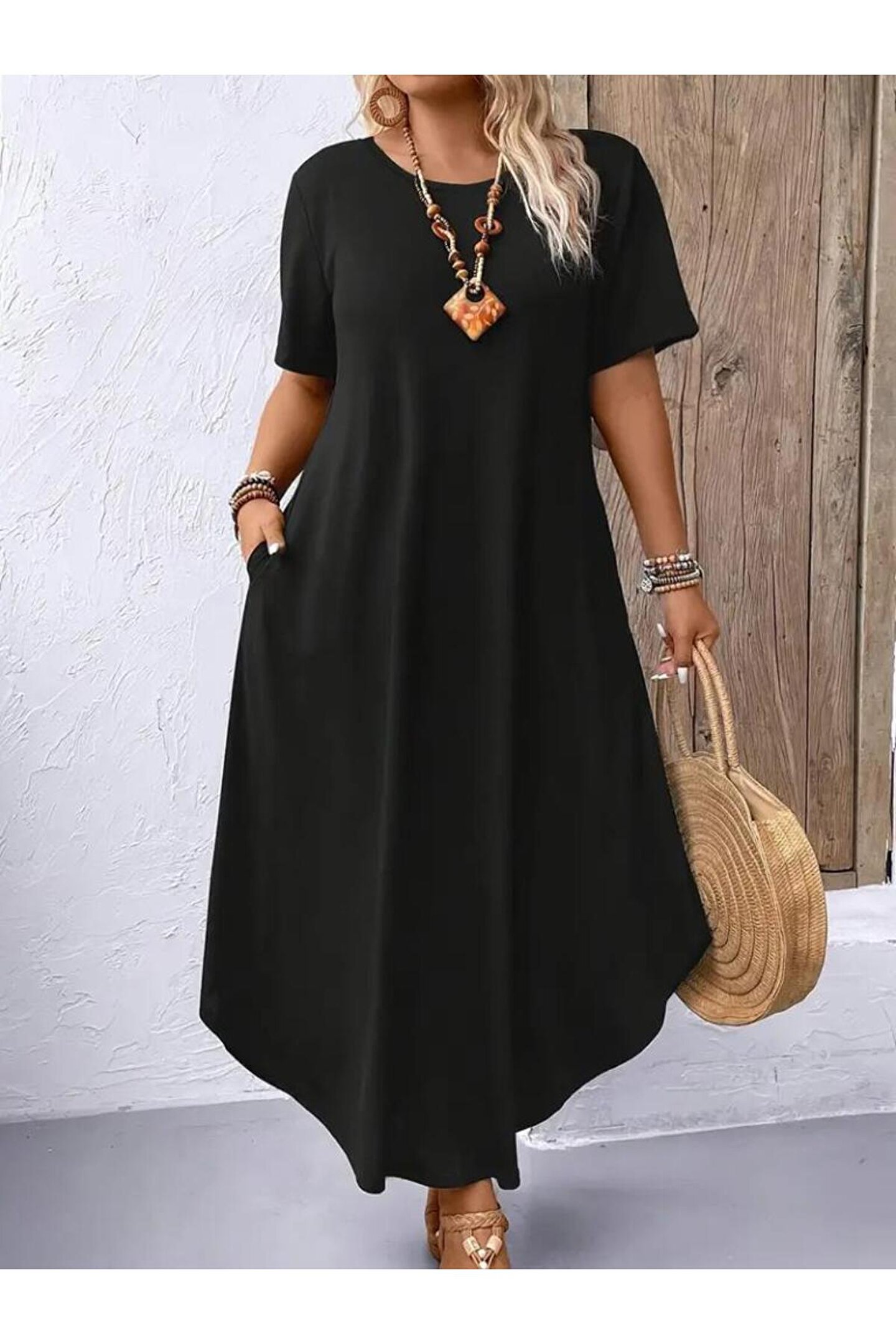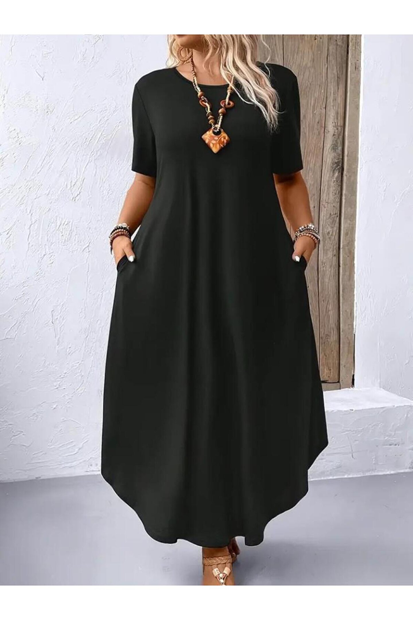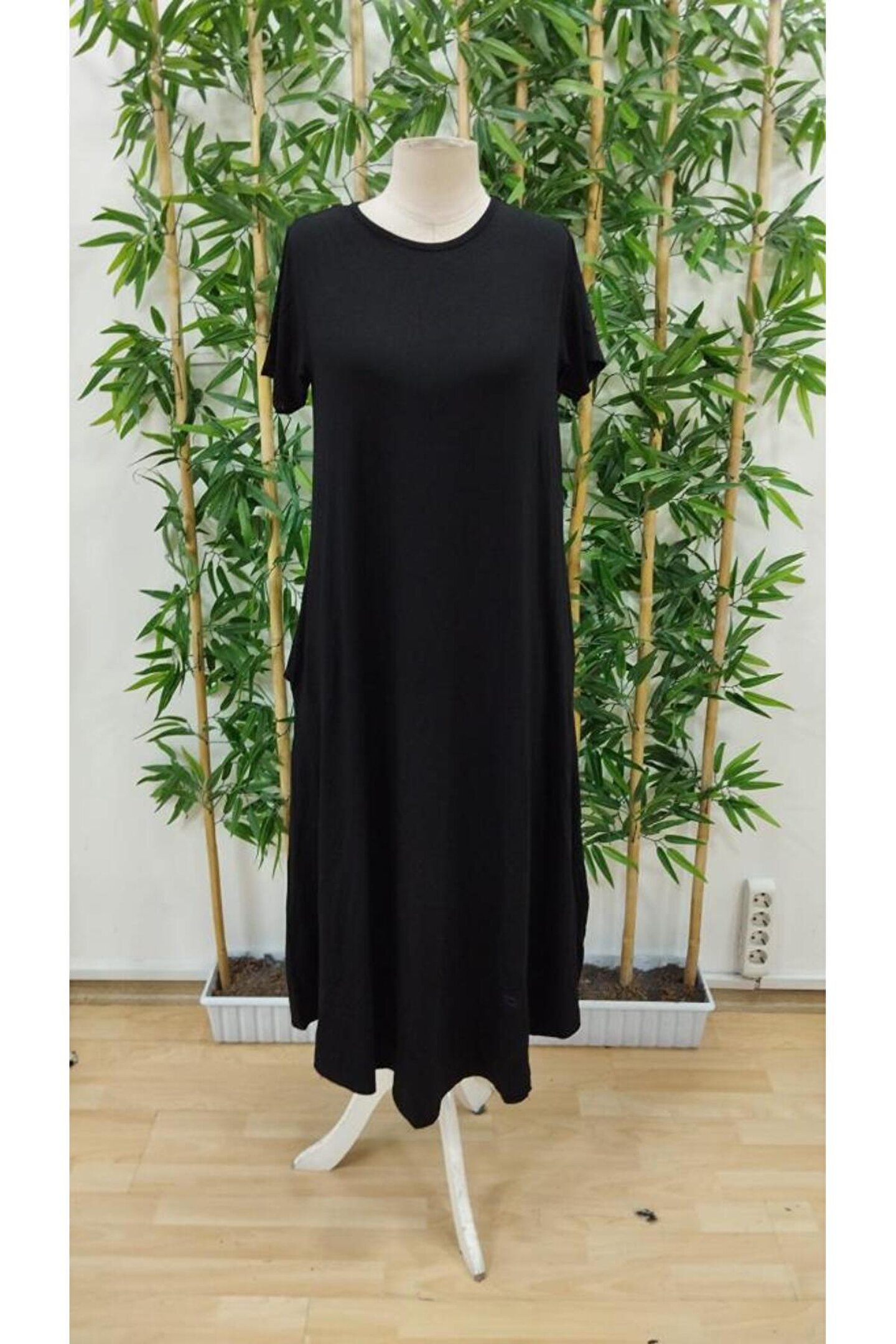 Kadın Kısa Kollu Bisiklet Yaka Cepli Salaş Viskon Elbise