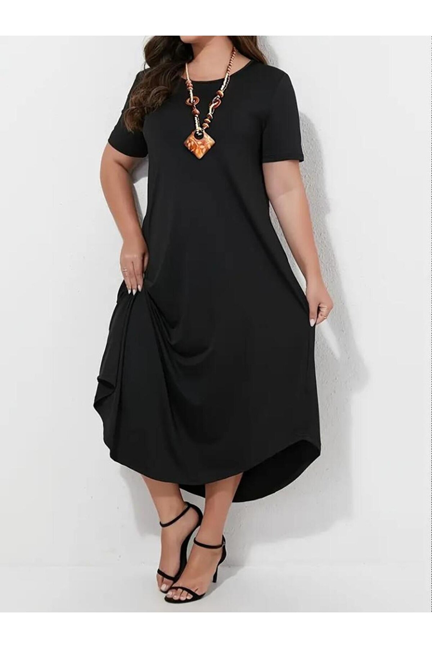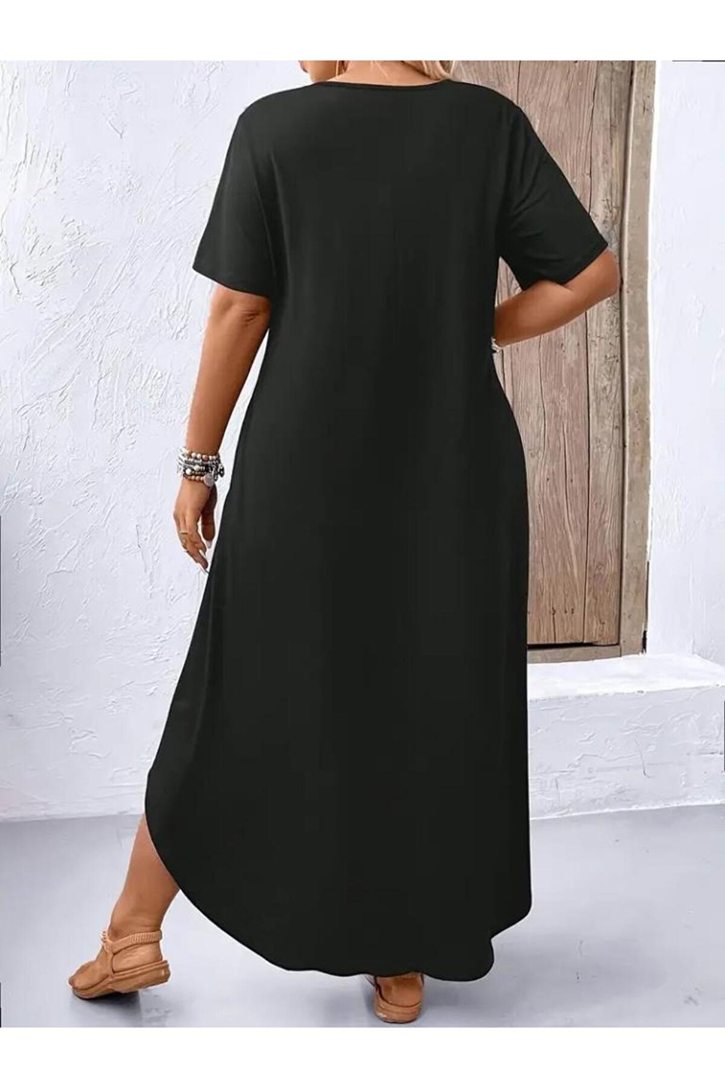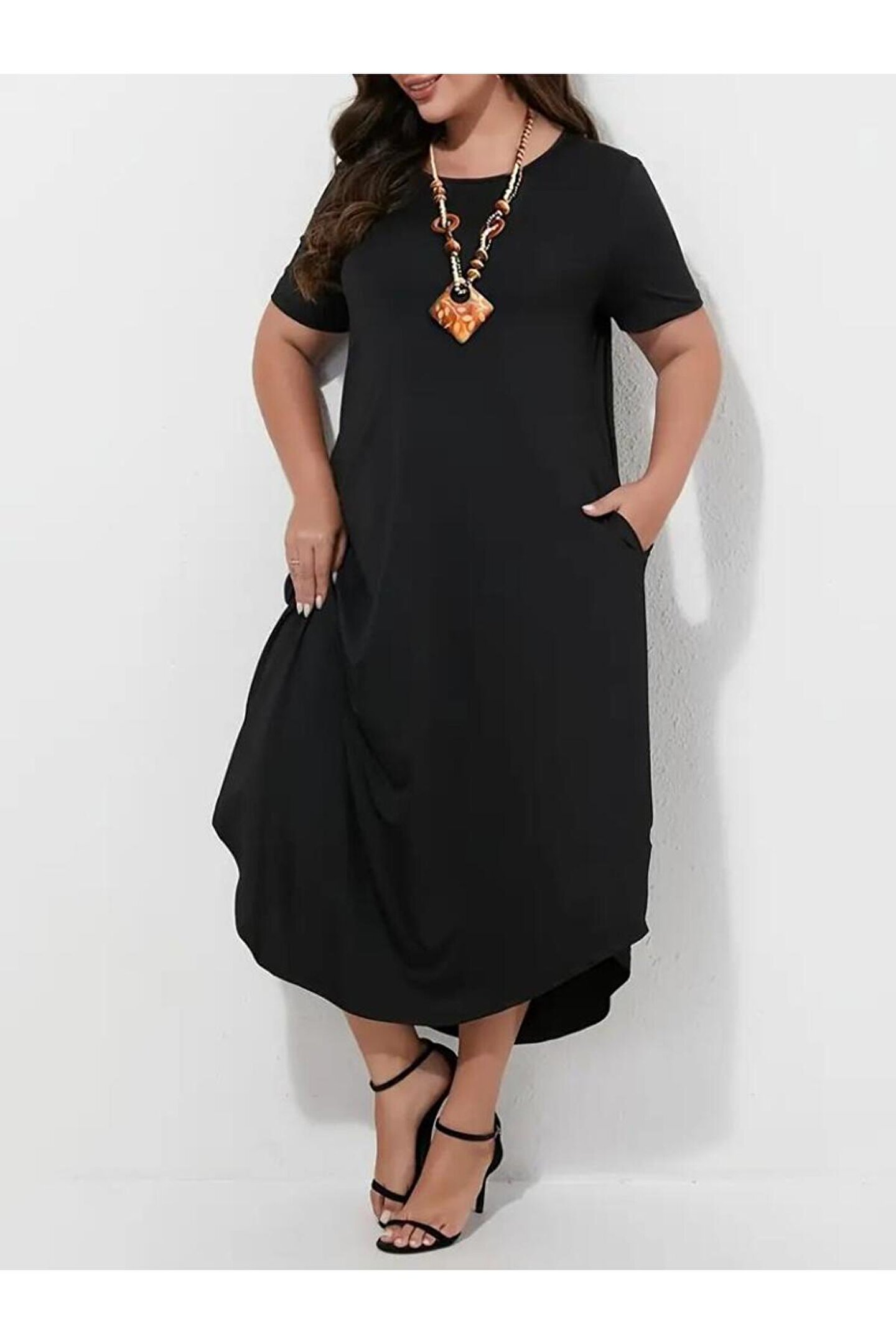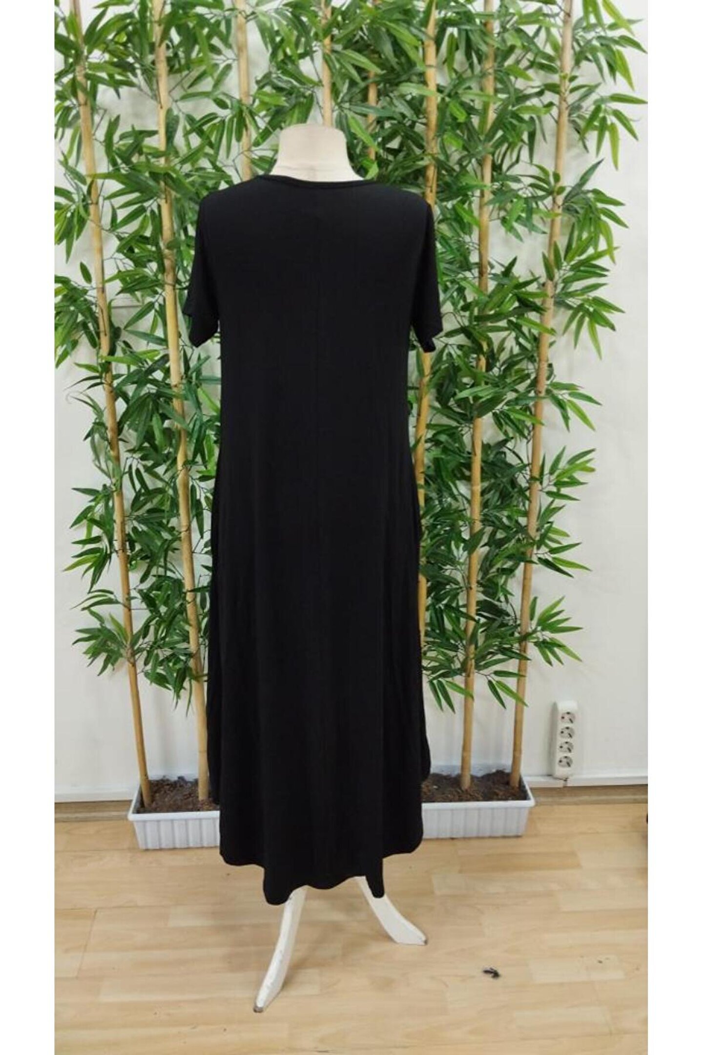 Kadın Kısa Kollu Bisiklet Yaka Cepli Salaş Viskon Elbise