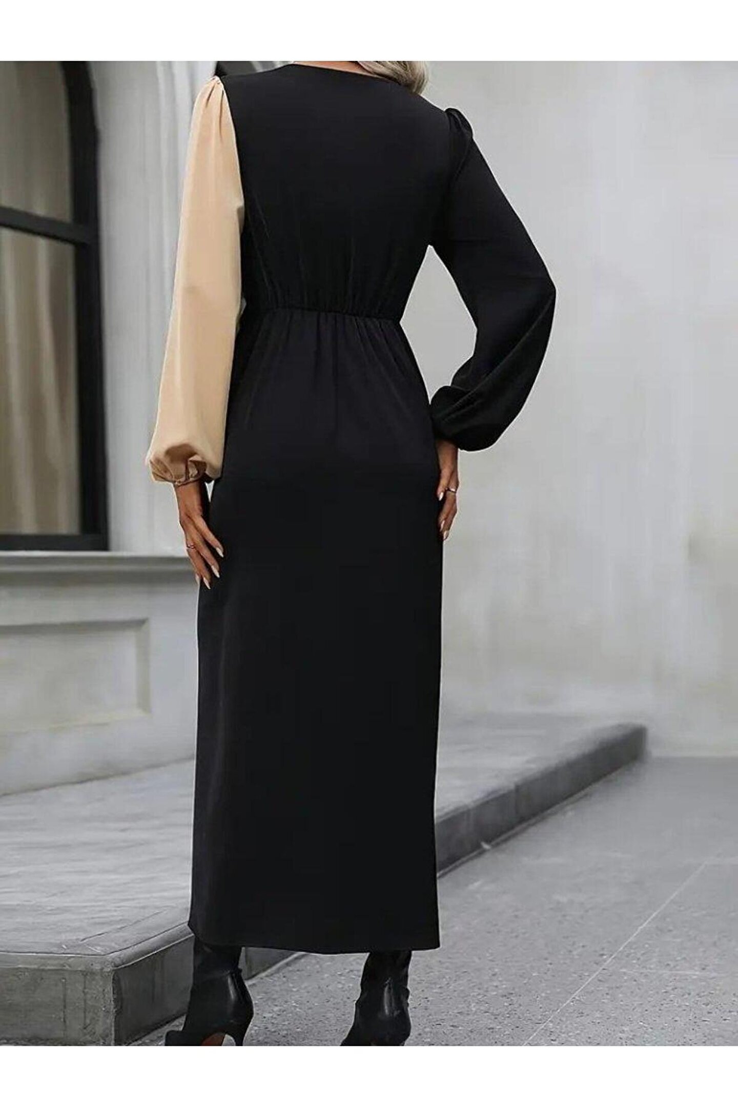 Kadın Uzun Kollu Kruvaze Yakalı Belden çapraz Detaylı çift Renkli Midi Ithal Krep Elbise