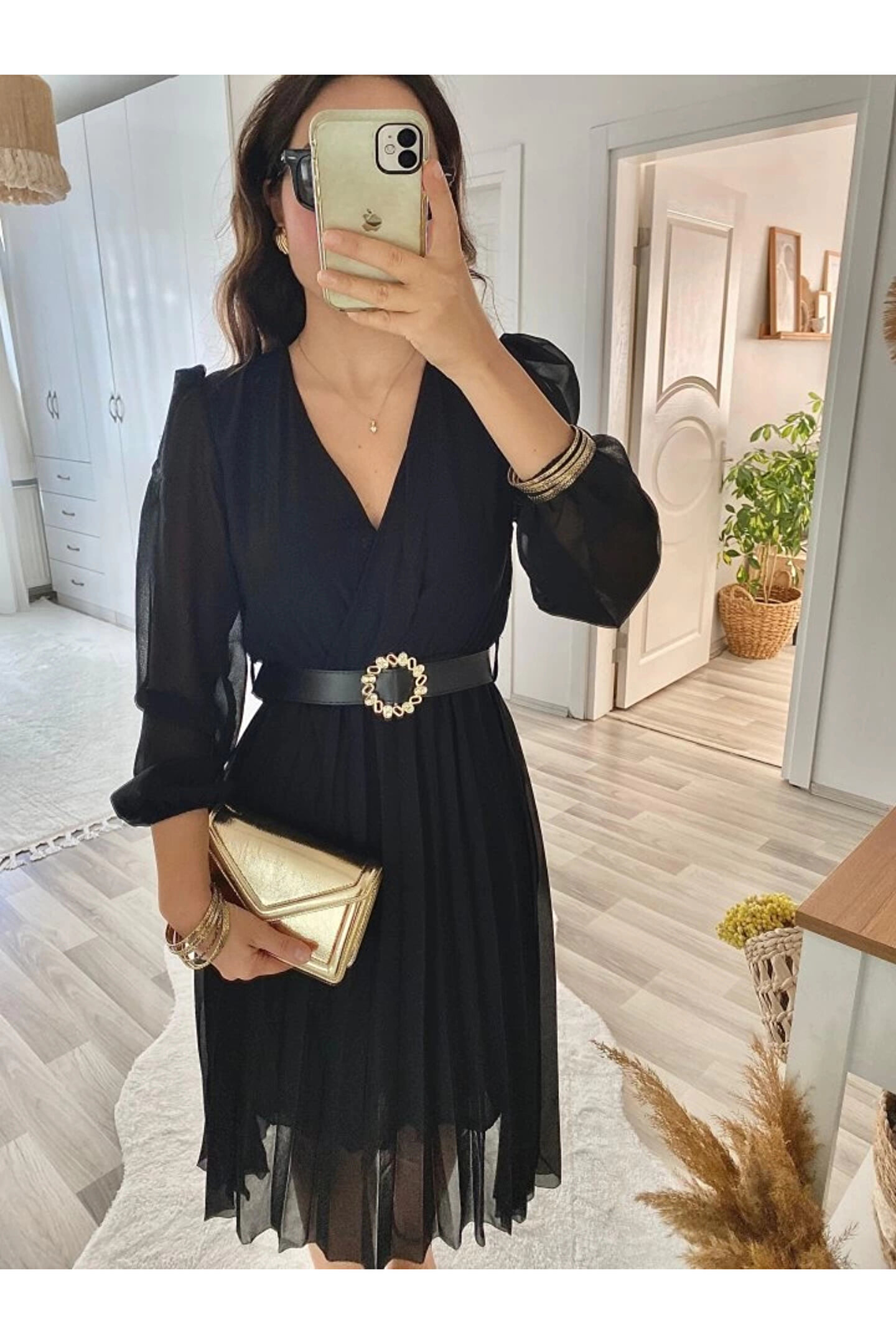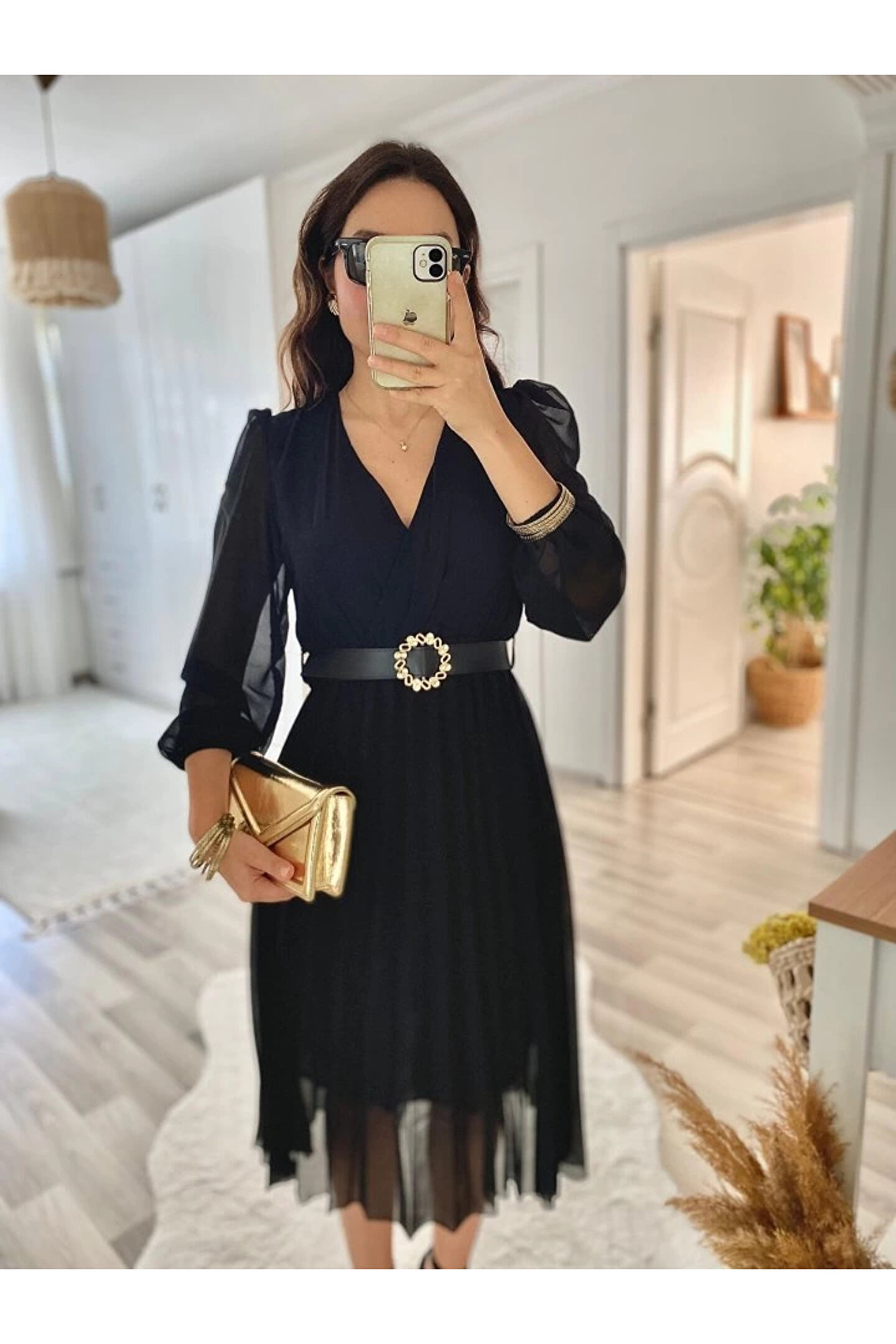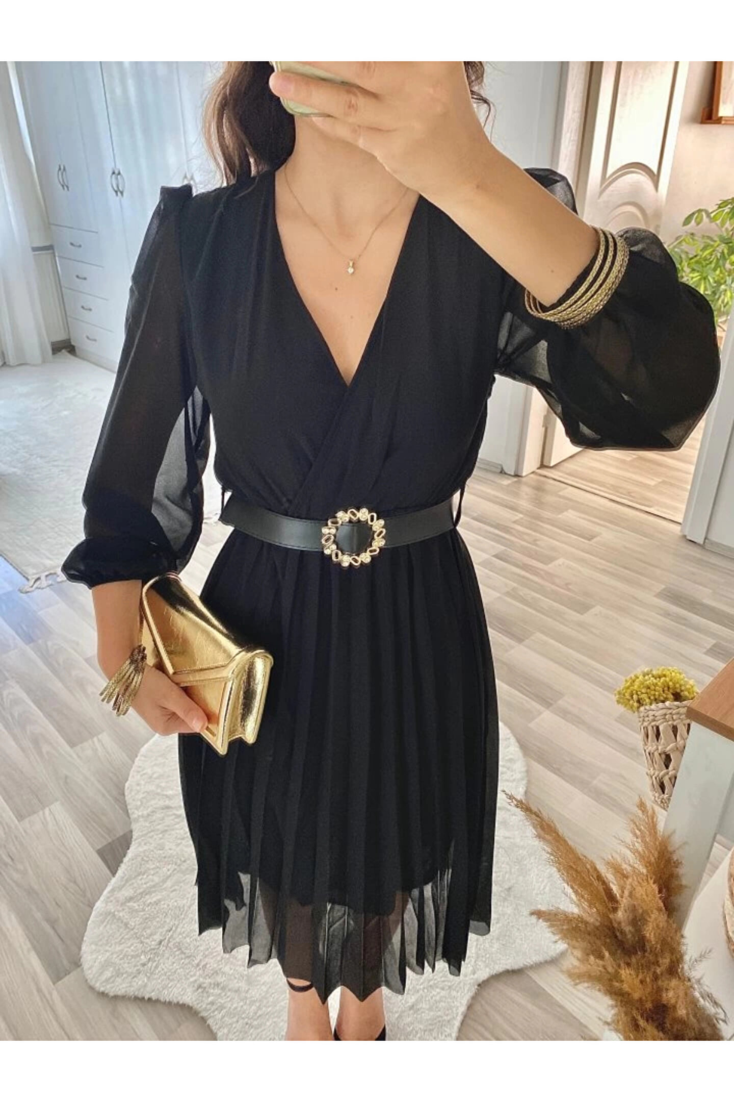 Kadın şifon Kumaş Astalı Kloş Kesim Kruvaze Yaka Midi Boy Elbise