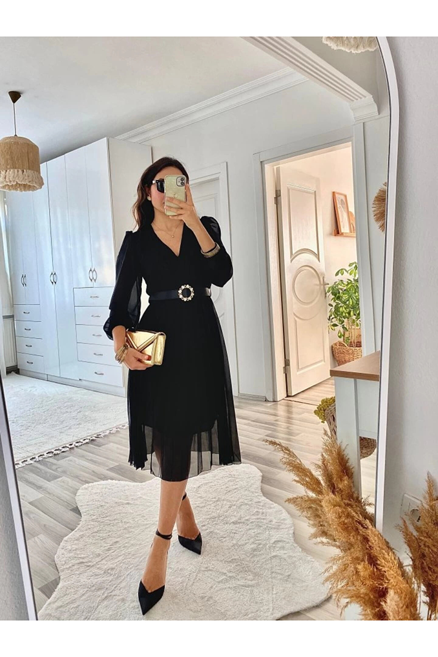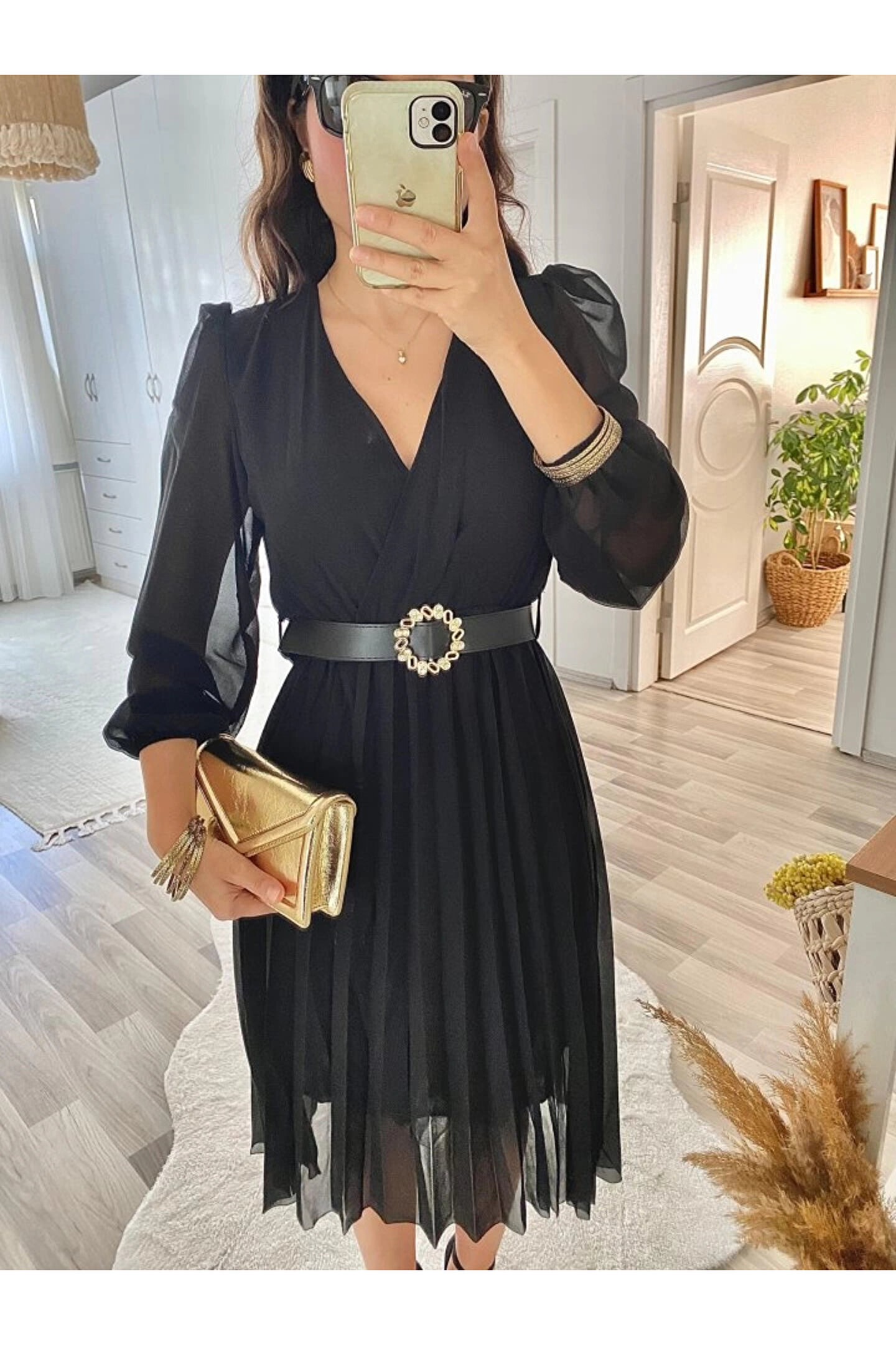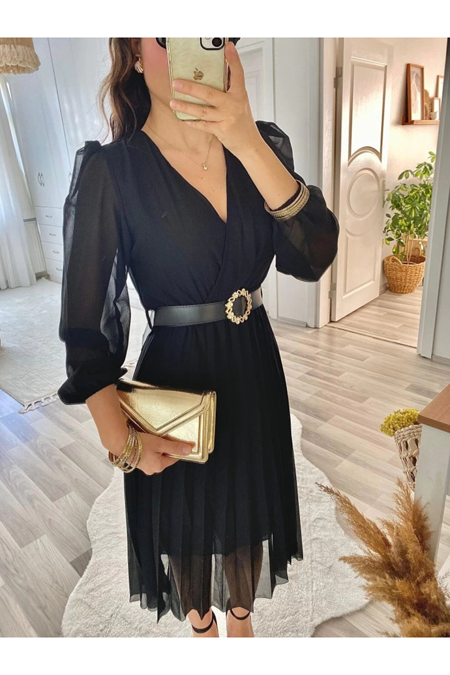 Kadın şifon Kumaş Astalı Kloş Kesim Kruvaze Yaka Midi Boy Elbise