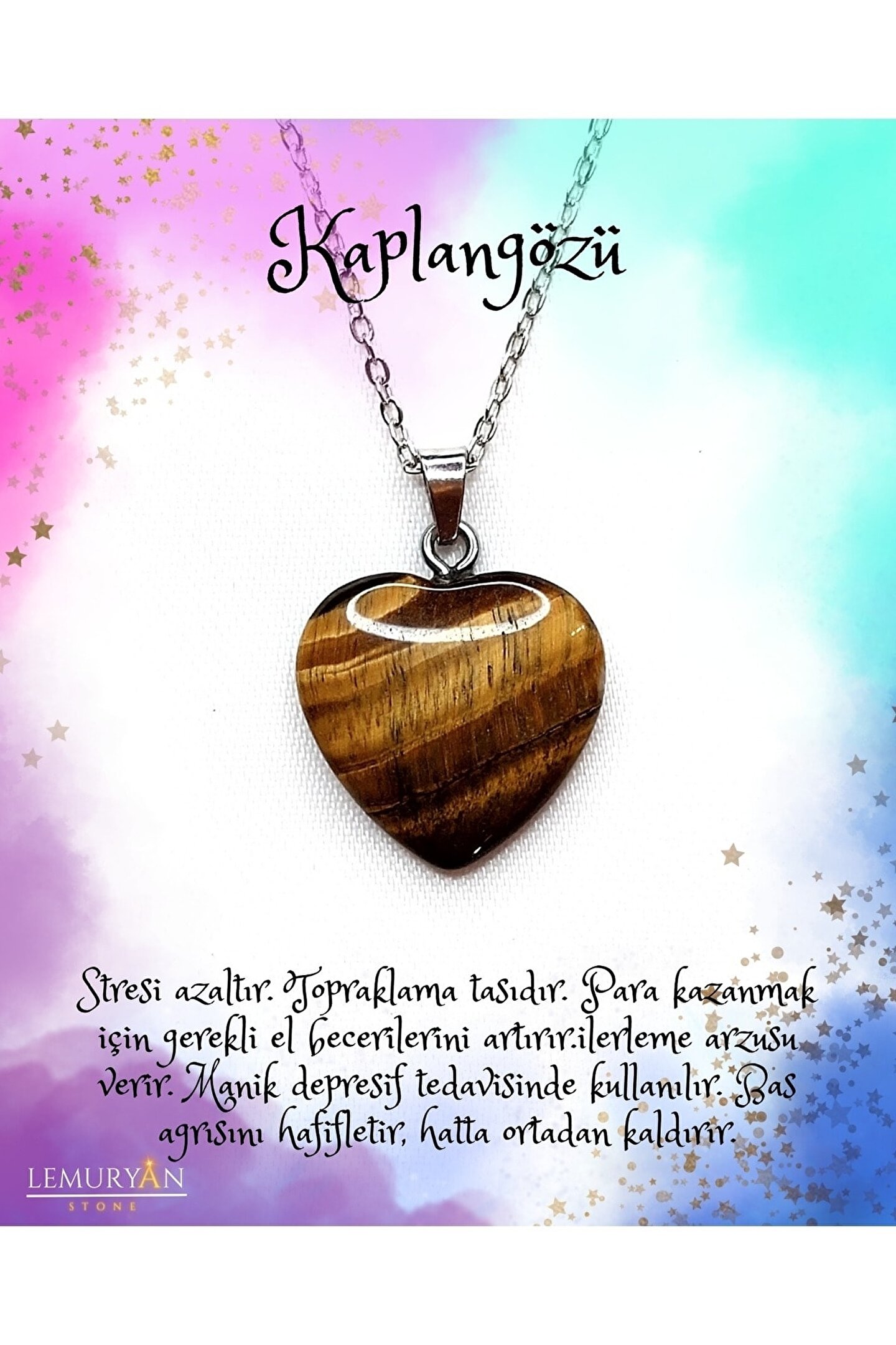 *Bilekliğimiz orijinal 1. kalite Kaplangözü taşından yapılmıştır. Kararmaz zincire takılı şekilde göndermekteyiz. Kalp kesimdir. Hediye Kutusunda gönderilmektedir; *Kaplangözü nazardan koruduğuna inanılan bir taştır. Sinir sistemini yatıştırır. Baş ağrısı için önemli bir taştır. Kararsız insanlar üzerinde taşımalıdırlar. Sindirim sistemi bozuklukları, dalak ve pankreas için faydalı etkileri vardır. Kemik ve eklemleri güçlendirir. Stresi azaltır. Topraklama taşıdır. Para kazanmak için gerekli el becerilerini artırır. Ilerleme arzusu verir. Manik depresif tedavisinde kullanılır. Baş ağrısını hafifletir, hatta ortadan kaldırır. Erkeksi enerji verir. Fiziksel ve ruhsal denge sağlar. Stresi azaltır. İlişkide olduğunuz insanla aranızda telepatik bir bağ kurmanızı sağlayabilir. Ağrıları hafifletir. Para kazanmak için gerekli el becerilerini artırır. İlerleme arzusu verir; *Toprak üstünde bir gün bekletebilir, tütsü dumanı ile lekeleyerek arındırabilirsiniz;
