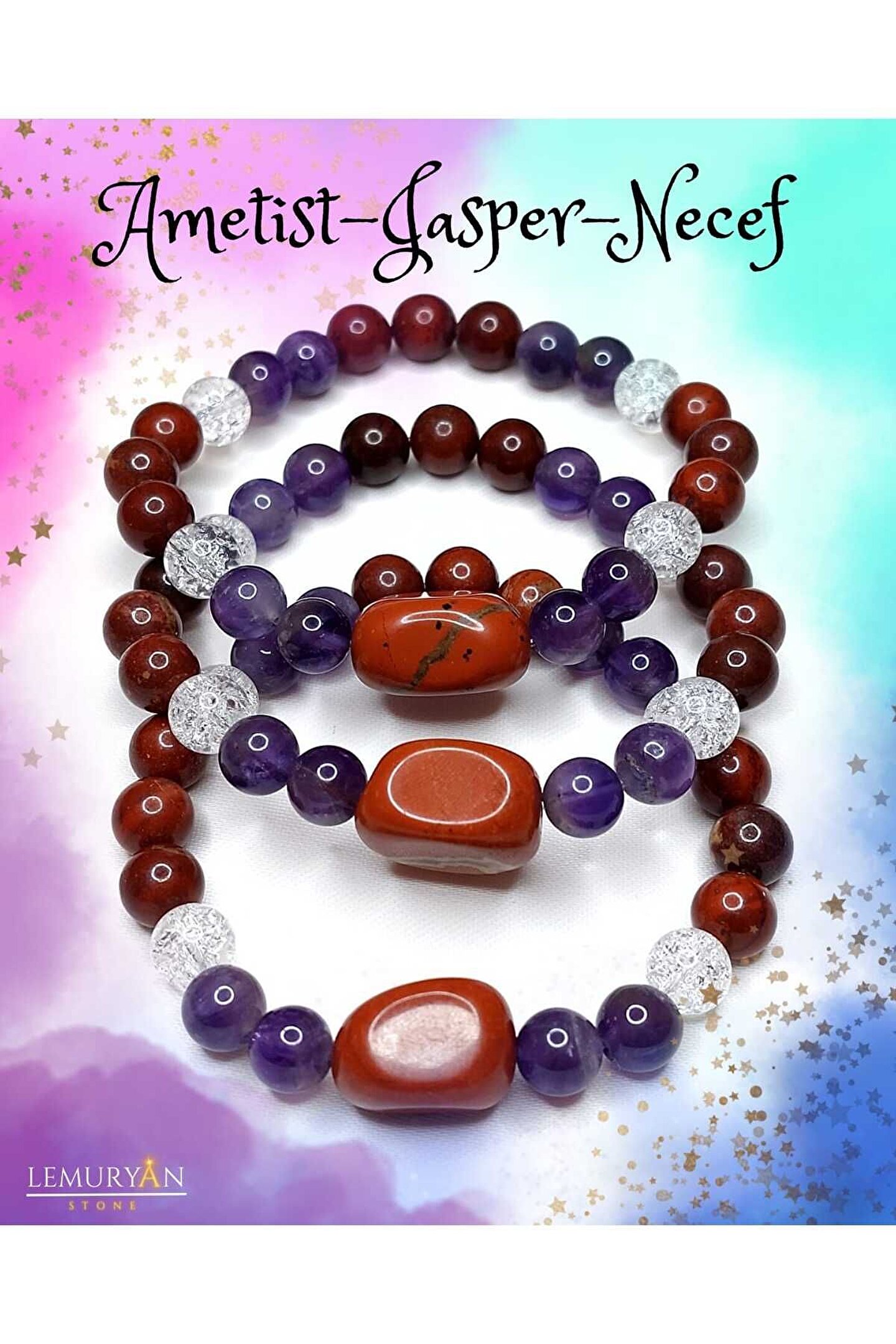 Doğal taş kullanımı sayesinde her bileklik benzersiz ve otantik bir görünüm sunar; Ametist ve jasper gibi değerli taşların birleşimi, hem şıklığı hem de enerjiyi bileğinizde taşımanızı sağlar; Doğal taşların renk ve desen farklılıkları, her bir bilekliğin eşsiz ve kişisel bir dokunuş kazanmasını garanti eder; Doğal taşların sağladığı zarif ve doğal görünüm, günlük kullanım için idealdir ve her türlü kıyafetle uyum sağlar;