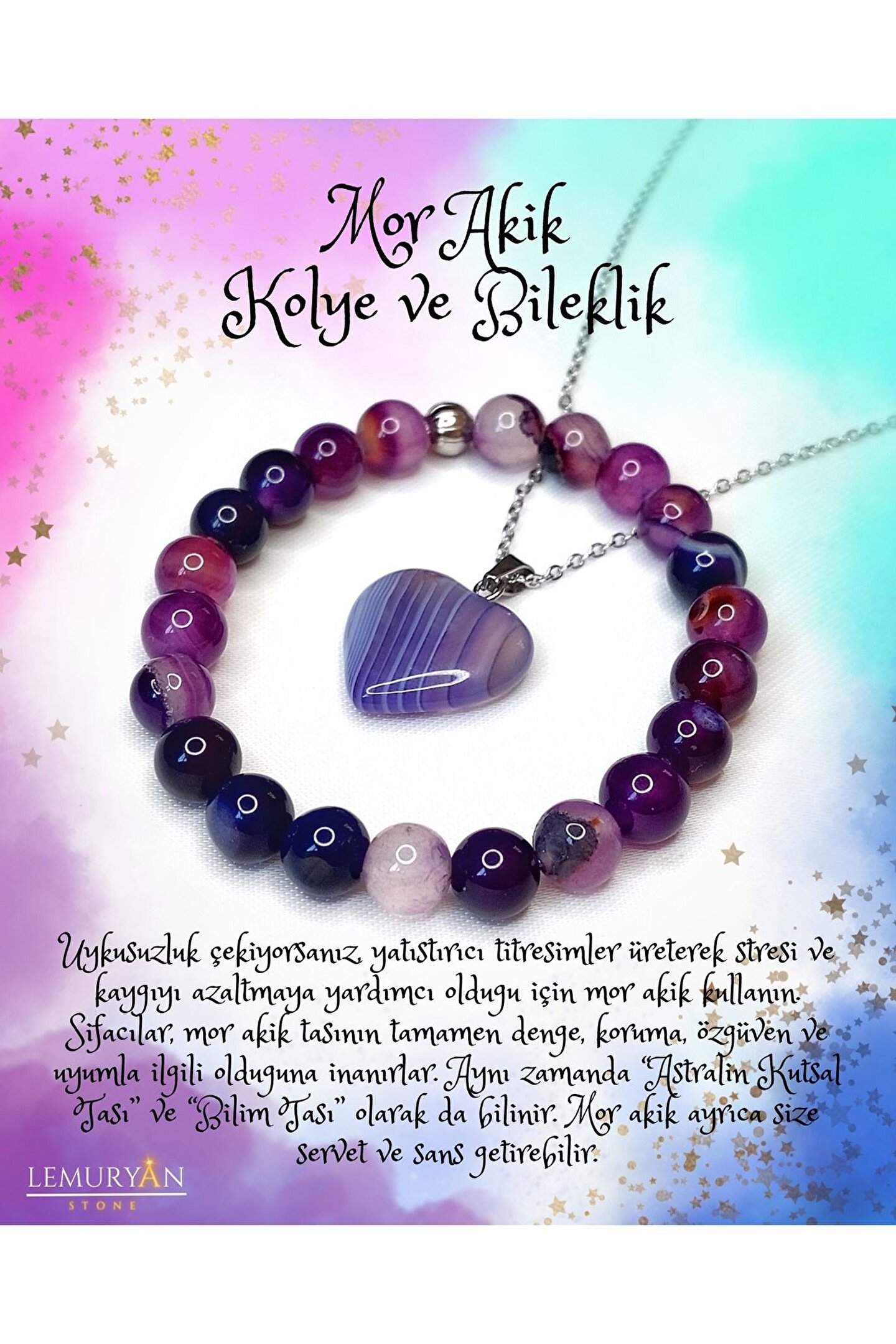 Doğal akik taşı, benzersiz desenleri ve renkleriyle dikkat çeken bir aksesuar seçeneği sunar; Altın kaplama detayları, hem şıklığı hem de dayanıklılığı bir arada garanti eder; Bileklik ve kolye seti, zarif tasarımıyla günlük kullanım için idealdir ve her türlü kıyafetle uyum sağlar; Orijinal doğaltaş mor akik bileklik & kolye seti, özel günlerde veya günlük kullanımda tercih edilebilecek mükemmel bir aksesuardır;