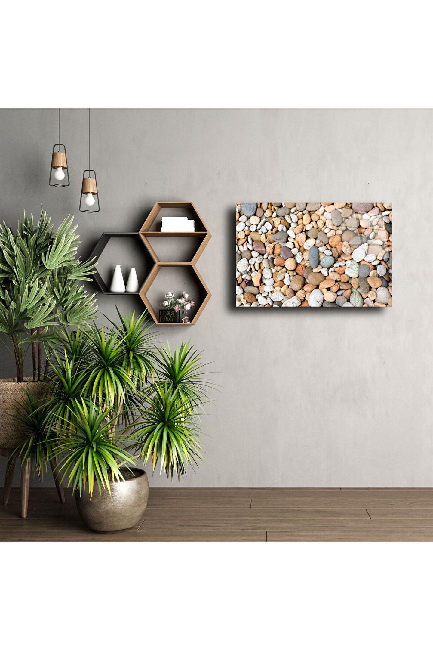 Bu açık tonlu doğal çakıl taşı desenli cam tablo, doğallığı ve sadeliği yansıtan zarif bir dekorasyon parçasıdır. Pastel renkli taşlar, mekâna yumuşaklık ve ferahlık kazandırırken, temperli cam yüzeyle birleşerek modern bir sanat eserine dönüşür. Dinginliği sevenler için görsel bir nefes alanı yaratır.