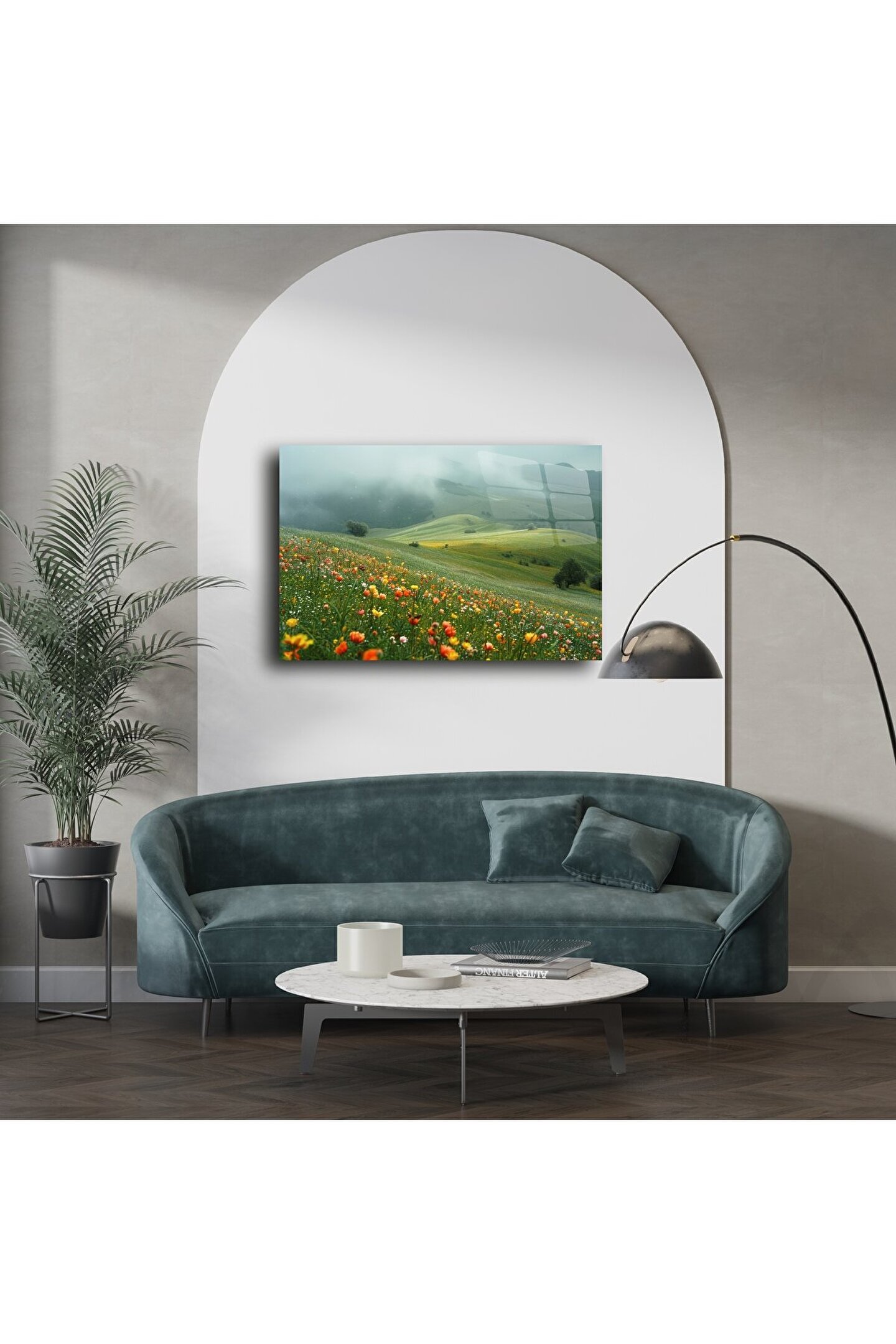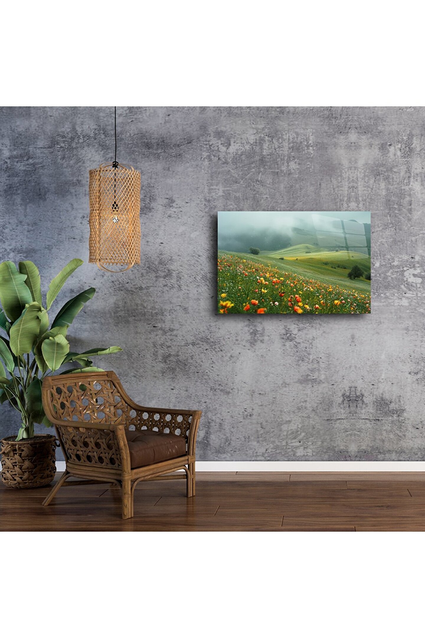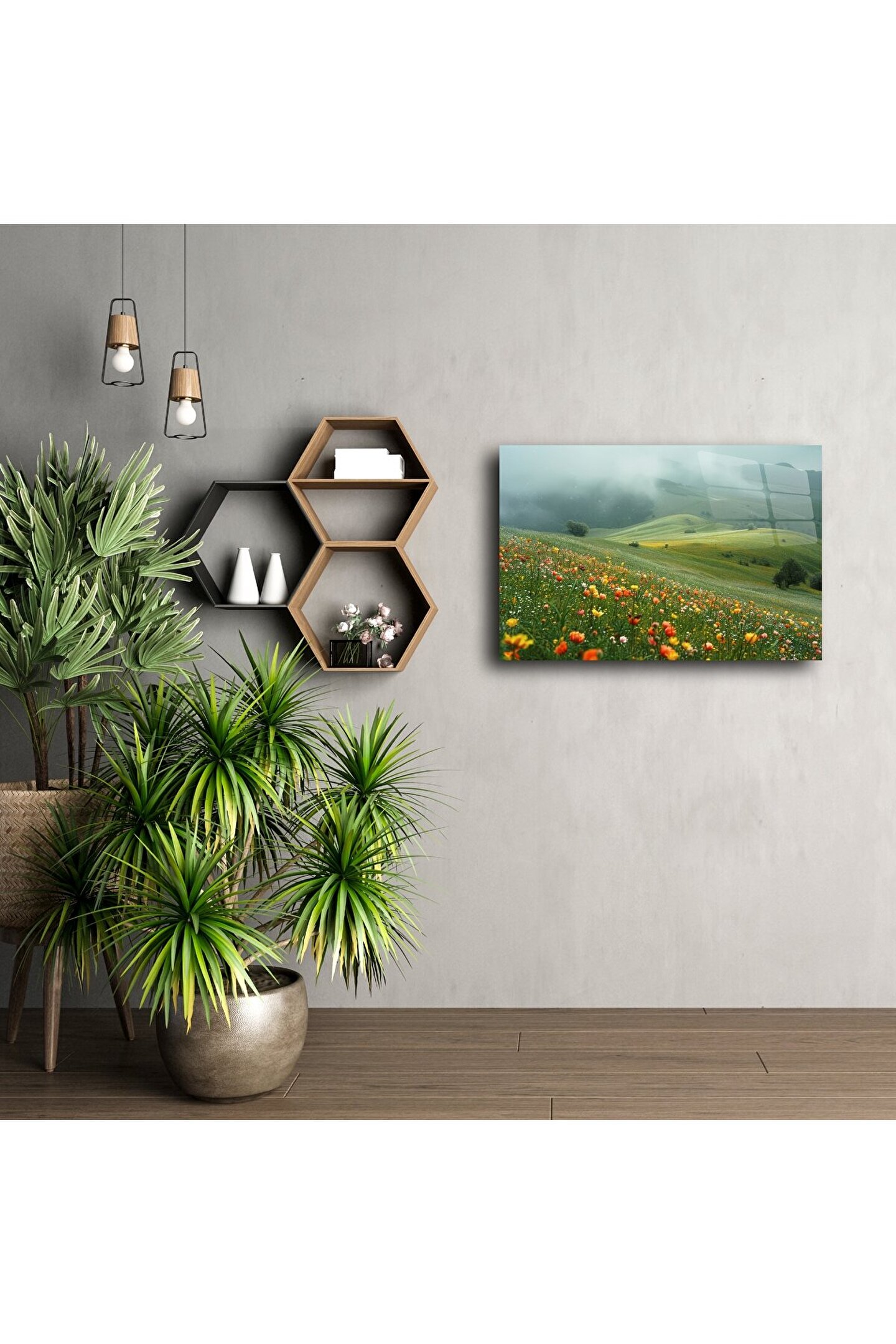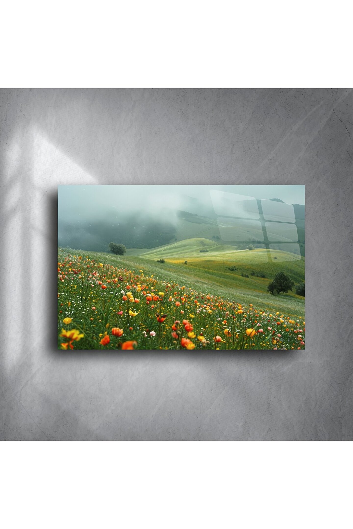 Bu yaban çiçeği manzara duvar sanatı ile huzurlu bir rüyaya adım atın. Sisle kaplı yumuşak tepeler ve canlı çiçeklerin oluşturduğu renk patlamaları, bulunduğu ortama uyum ve canlılık katıyor. Doğayla derin bir bağ, yenilenme ve sakinlik hissi uyandırır — özellikle iç huzuru arayanlar için ideal bir parça.