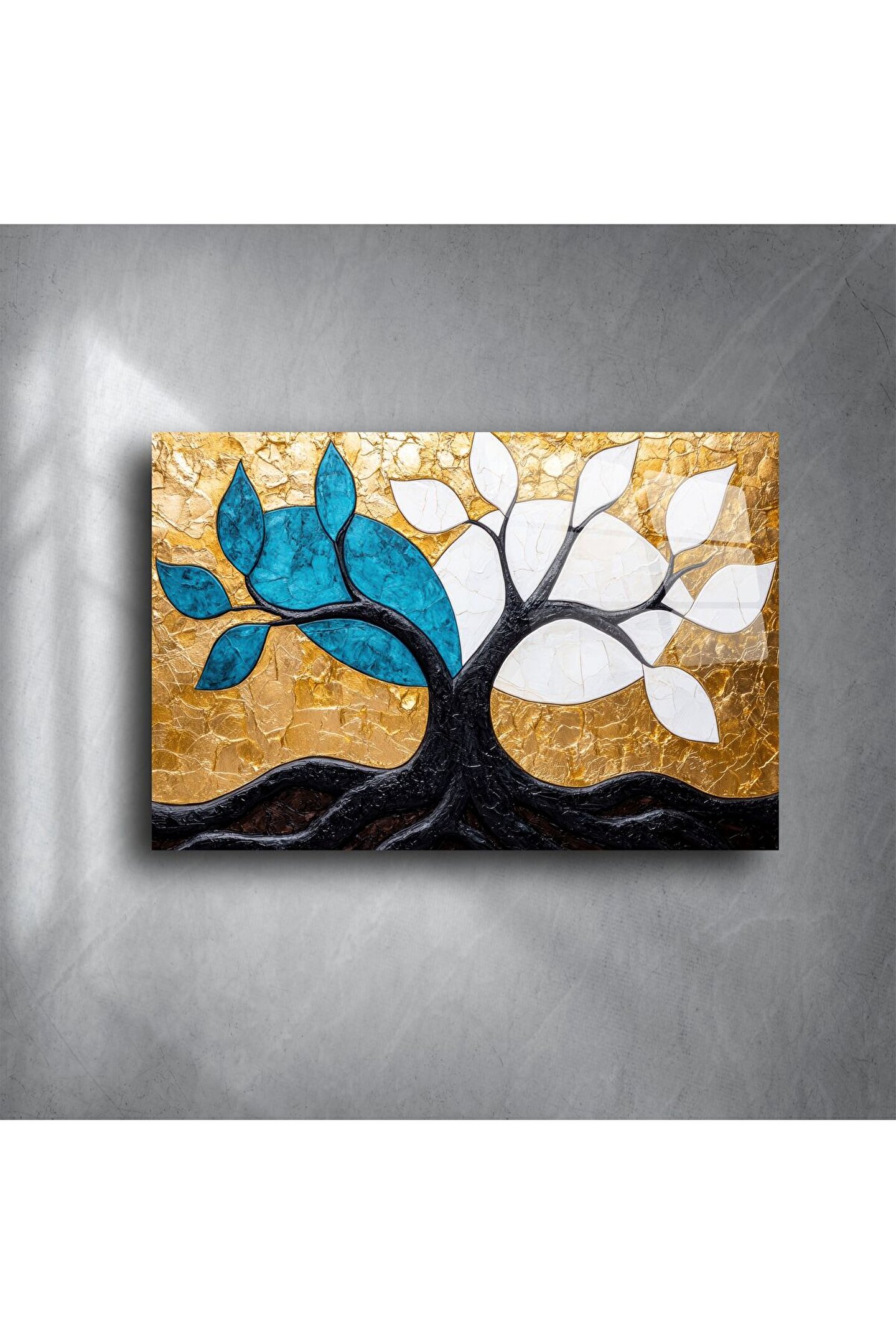 Göz alıcı mavi ve beyaz yaprak detayları, altın arka planla güçlü bir kontrast oluşturur ve her bakışta ruhunuzu tazeler. Oturma odası, ofis, giriş holü veya hediye olarak tercih edilebilecek eşsiz bir dekor parçasıdır.