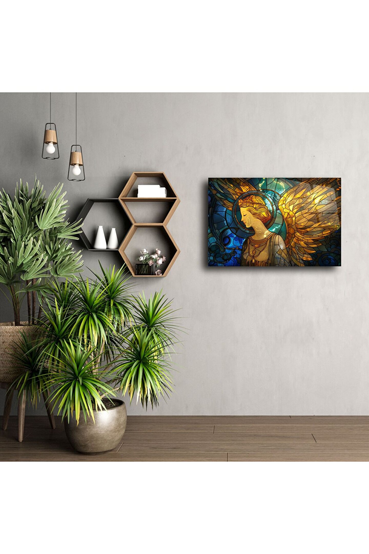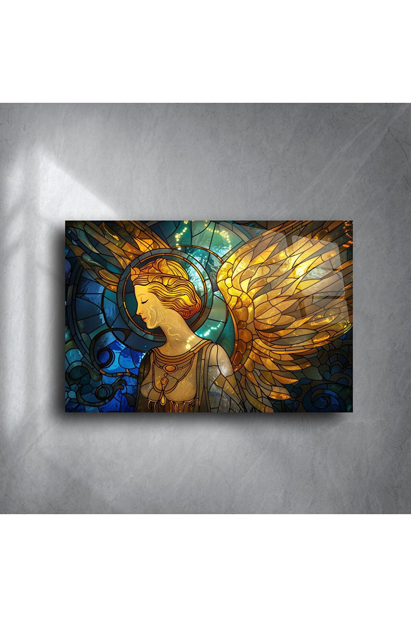 Bu etkileyici cam tablo, zarif ve huzur dolu bakışlara sahip altın kanatlı bir melek figürünü göz alıcı vitray efektleriyle birleştiriyor. Derin lacivert ve parlak altın tonlarının dans ettiği cam yüzey, ışıkla buluştuğunda eşsiz bir parıltı yaratıyor.