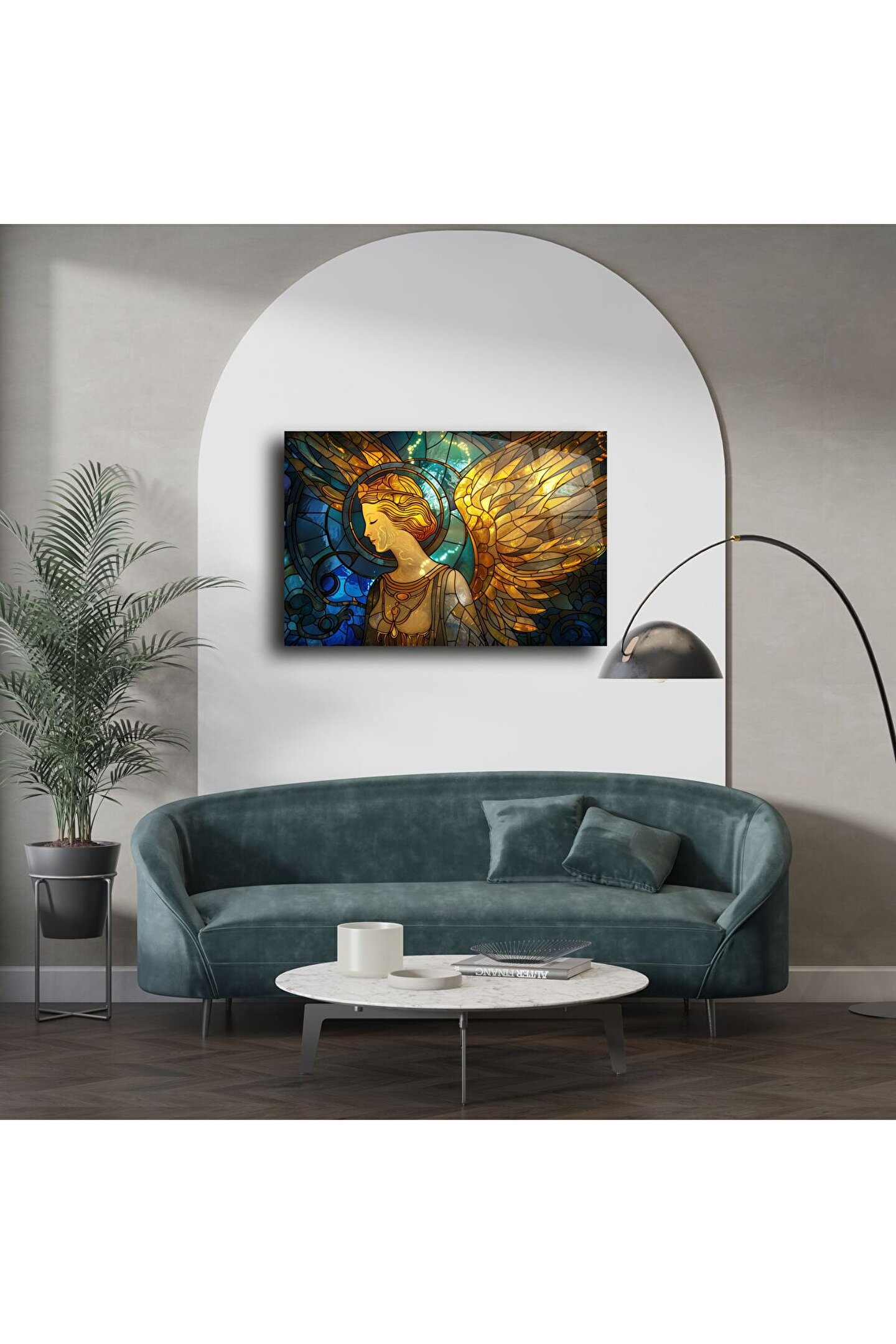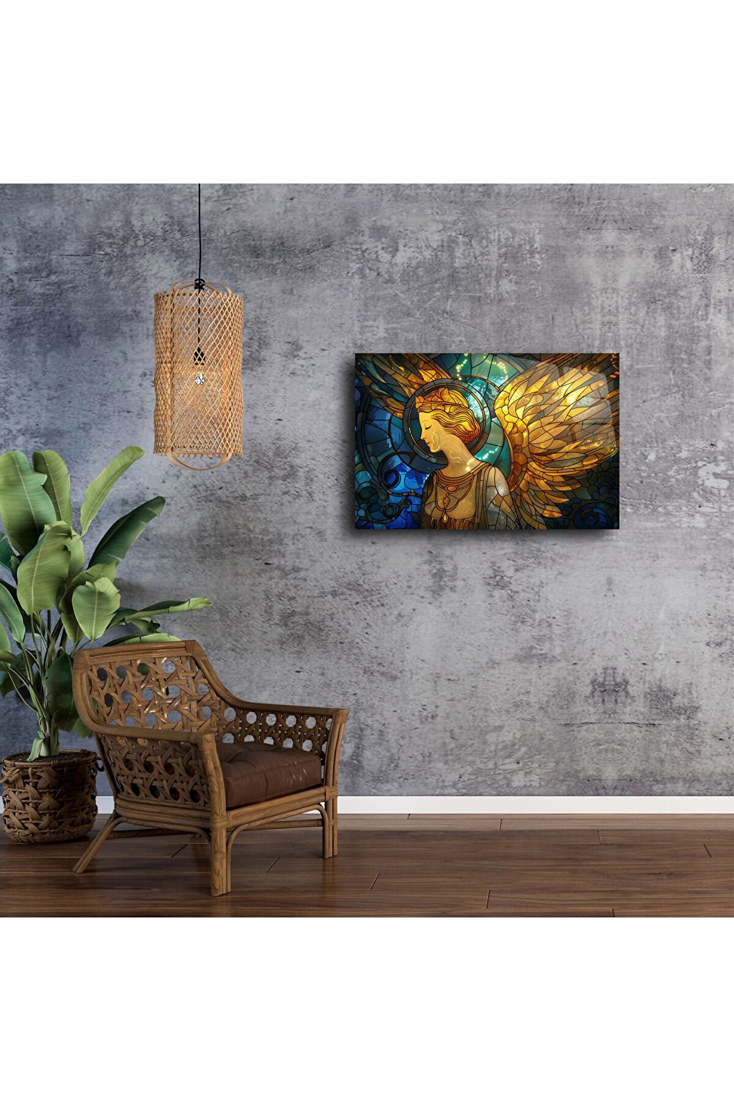 Bu etkileyici cam tablo, zarif ve huzur dolu bakışlara sahip altın kanatlı bir melek figürünü göz alıcı vitray efektleriyle birleştiriyor. Derin lacivert ve parlak altın tonlarının dans ettiği cam yüzey, ışıkla buluştuğunda eşsiz bir parıltı yaratıyor.