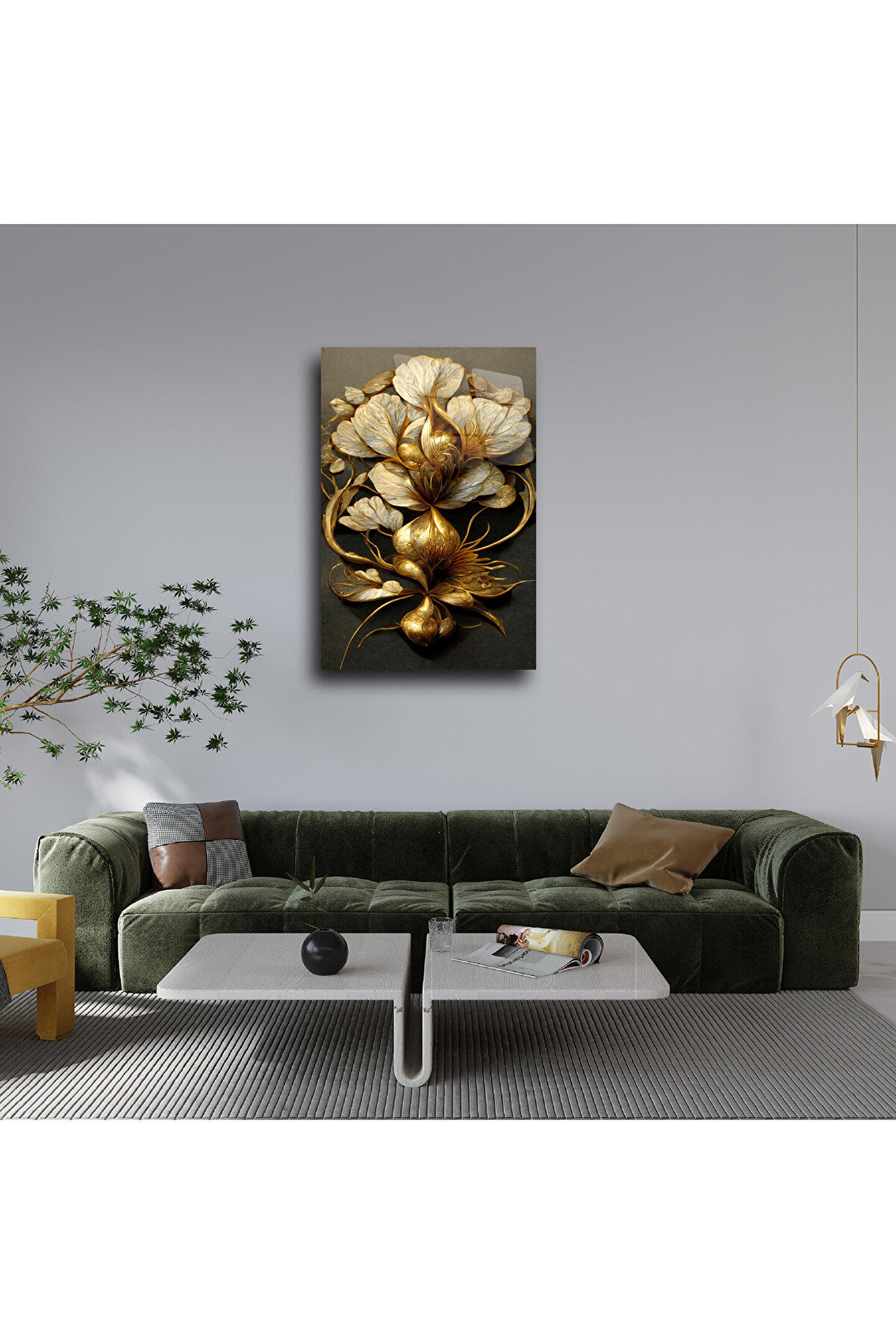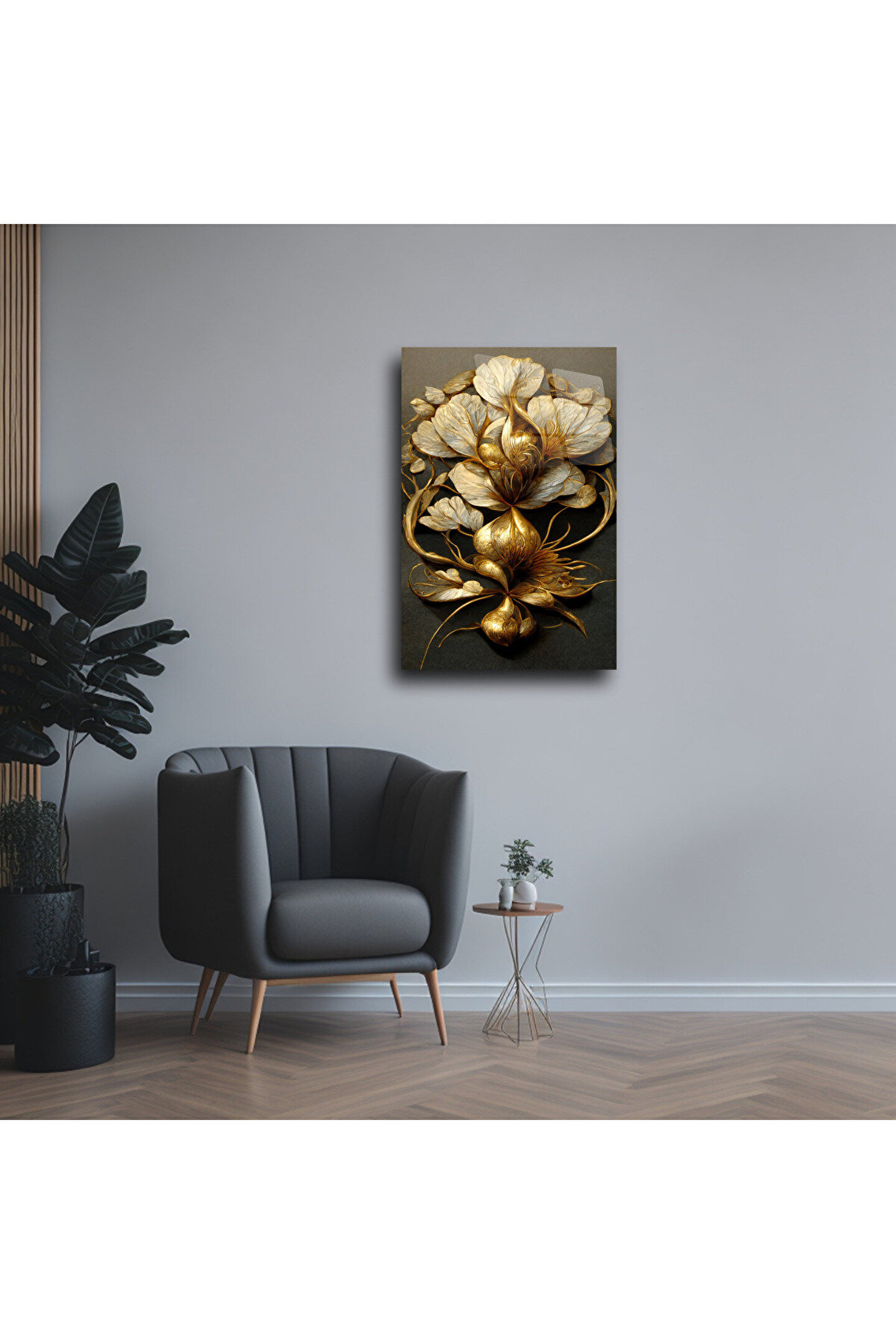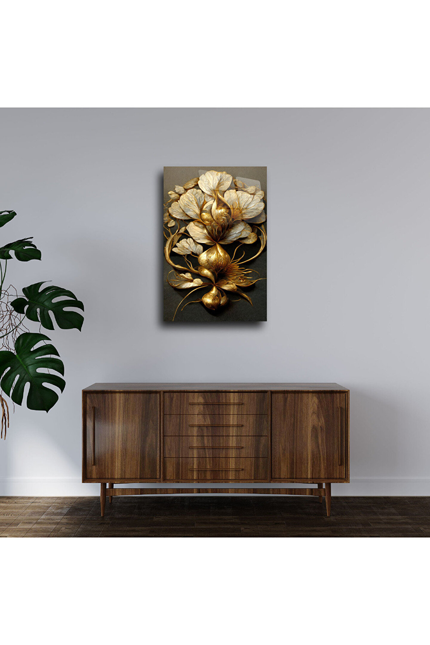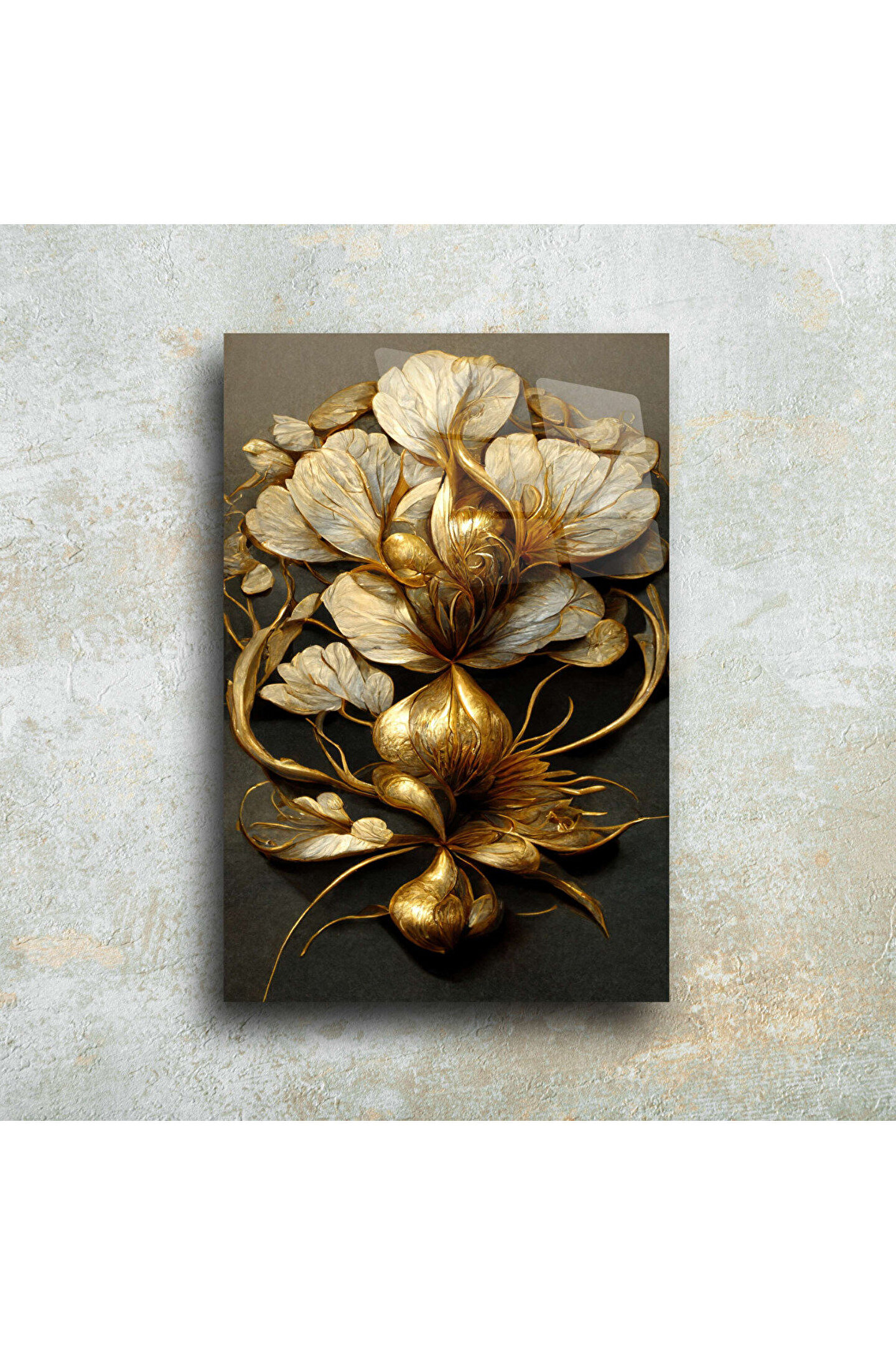 LEYLASER Altın Saksıda Beyaz Çiçekler Cam Tablo Duvar Dekoru
