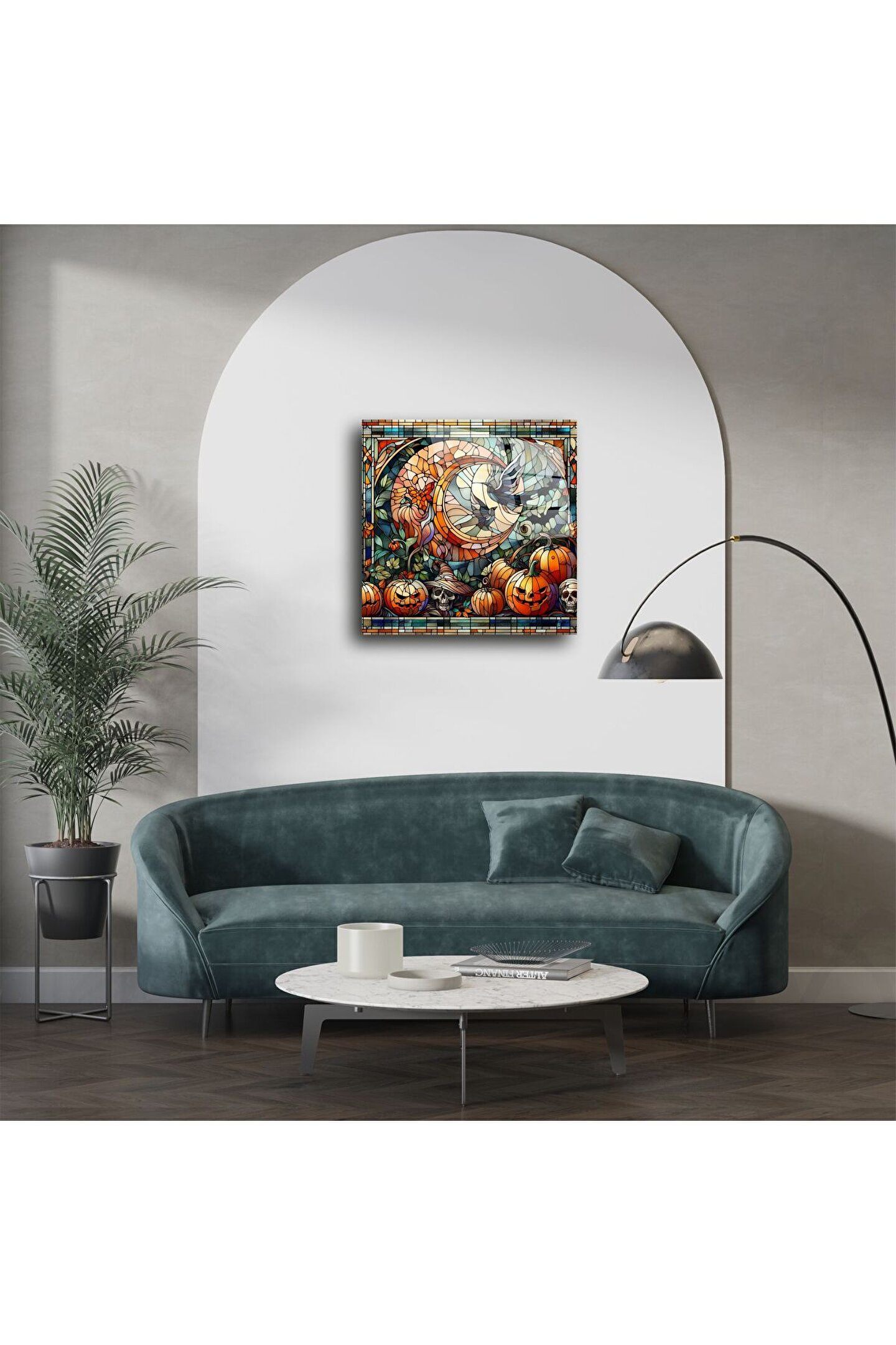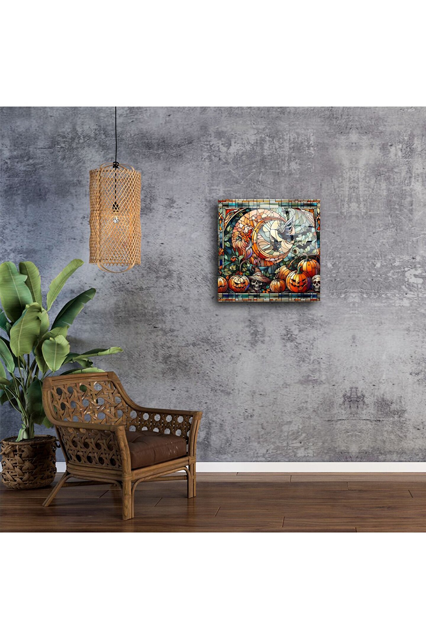 Balkabakları, parlayan hilal ay, kafatasları ve sonbahar yapraklarıyla süslenmiş bu gotik vitray duvar paneli ile Halloween ruhunu evinize taşıyın. Her detayı gizemi, büyüyü ve serin sonbahar akşamlarının cazibesini hissettirecek şekilde tasarlandı.
