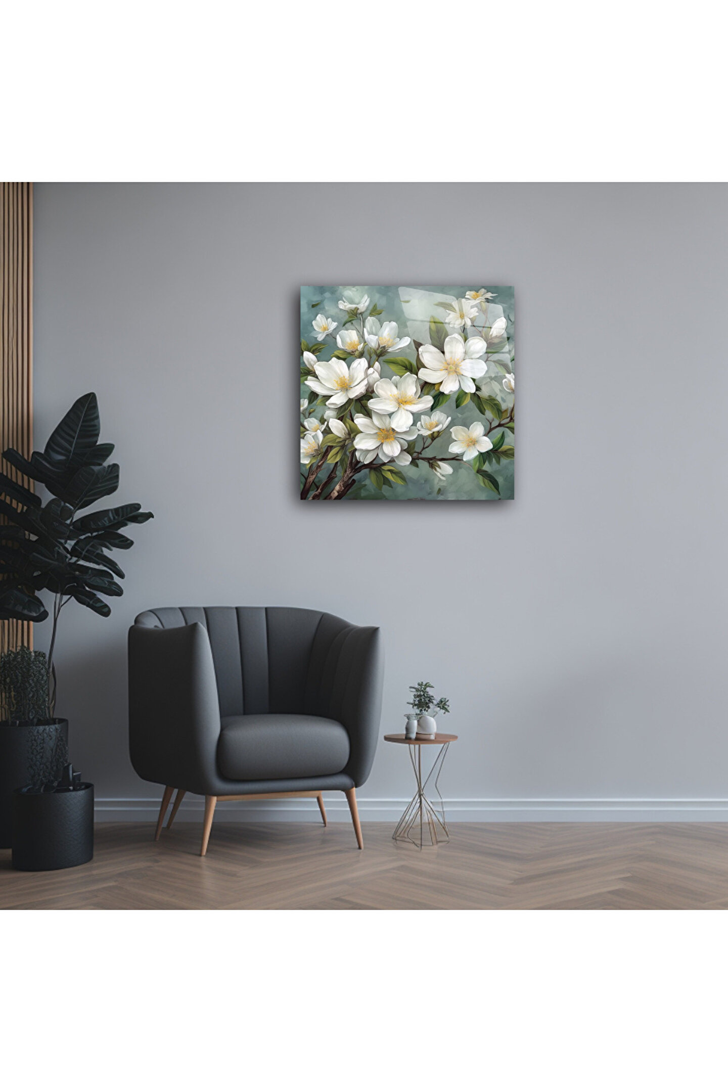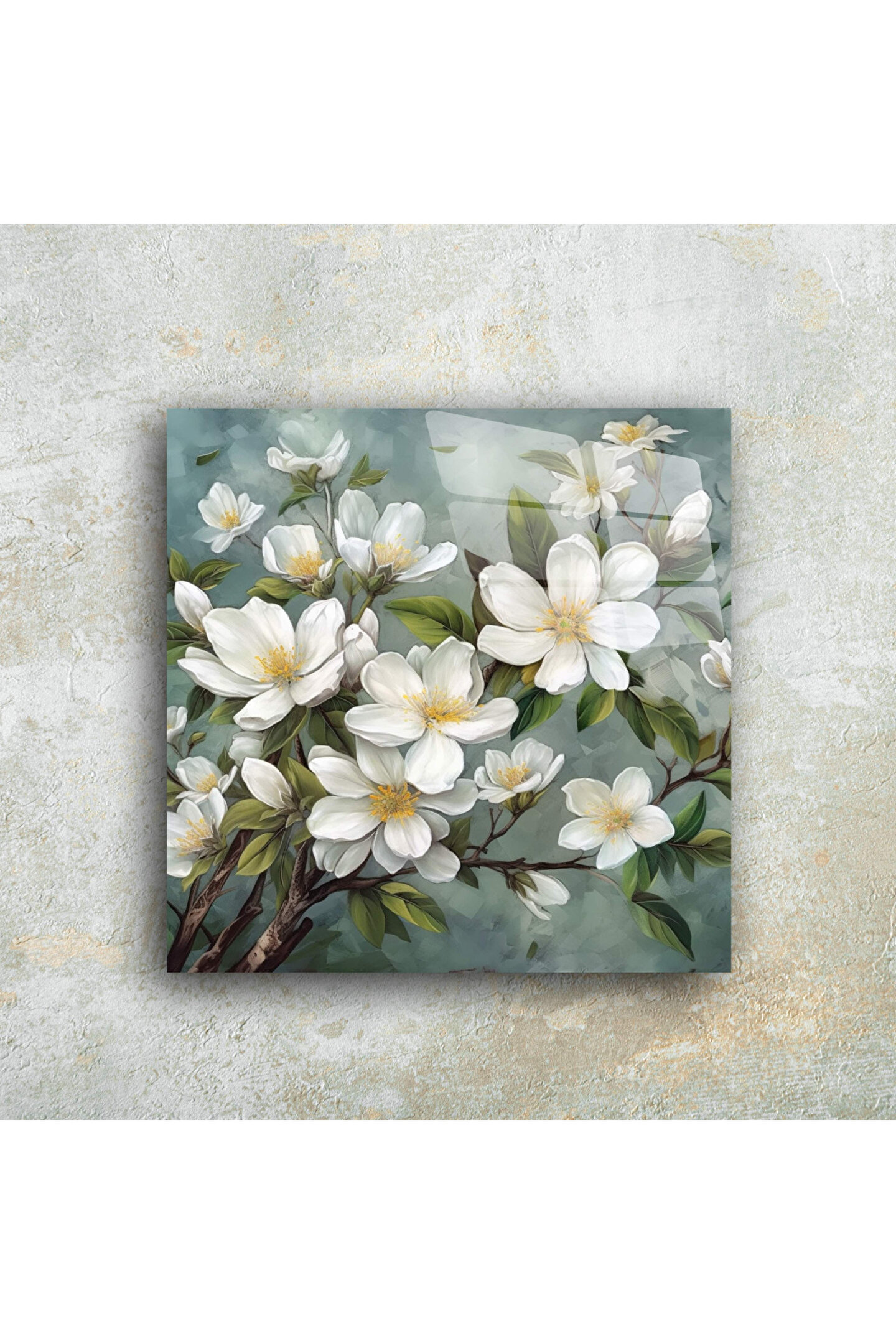 LEYLASER Beyaz Çiçekler Cam Tablo Duvar Dekoru