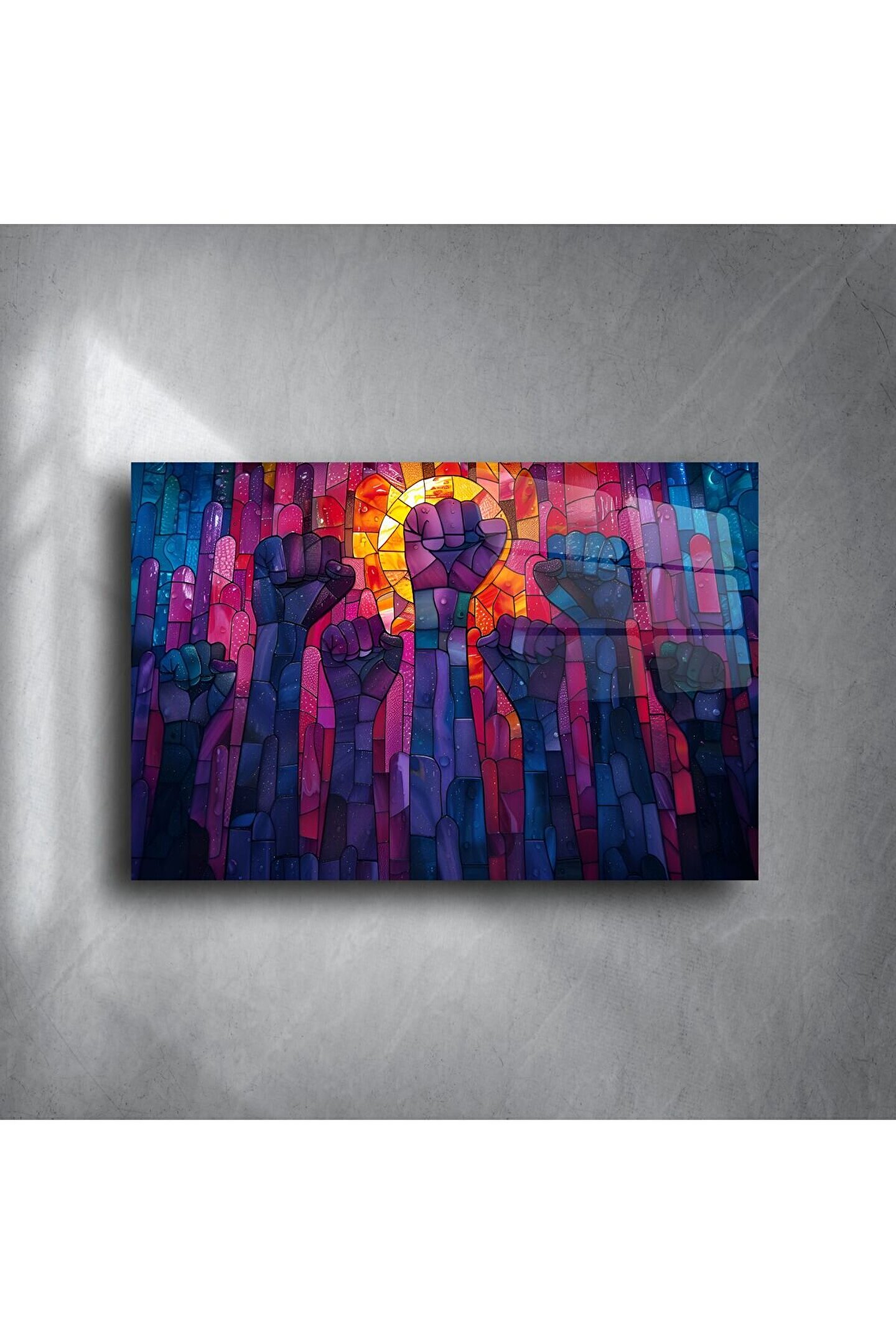 Renklerin ve ifadenin bir araya geldiği bu Cam Duvar Sanatı Direniş Paneli, yalnızca dekor değil; bir duruşun, umudun ve birliğin sanatla buluşmasıdır. Güçlü yumruk figürlerinin yer aldığı bu özel tasarım, yüksek kaliteli temperli camüzerine işlenmiş ve ışığı yansıtarak mekânınıza canlılık katmak üzere üretilmiştir.