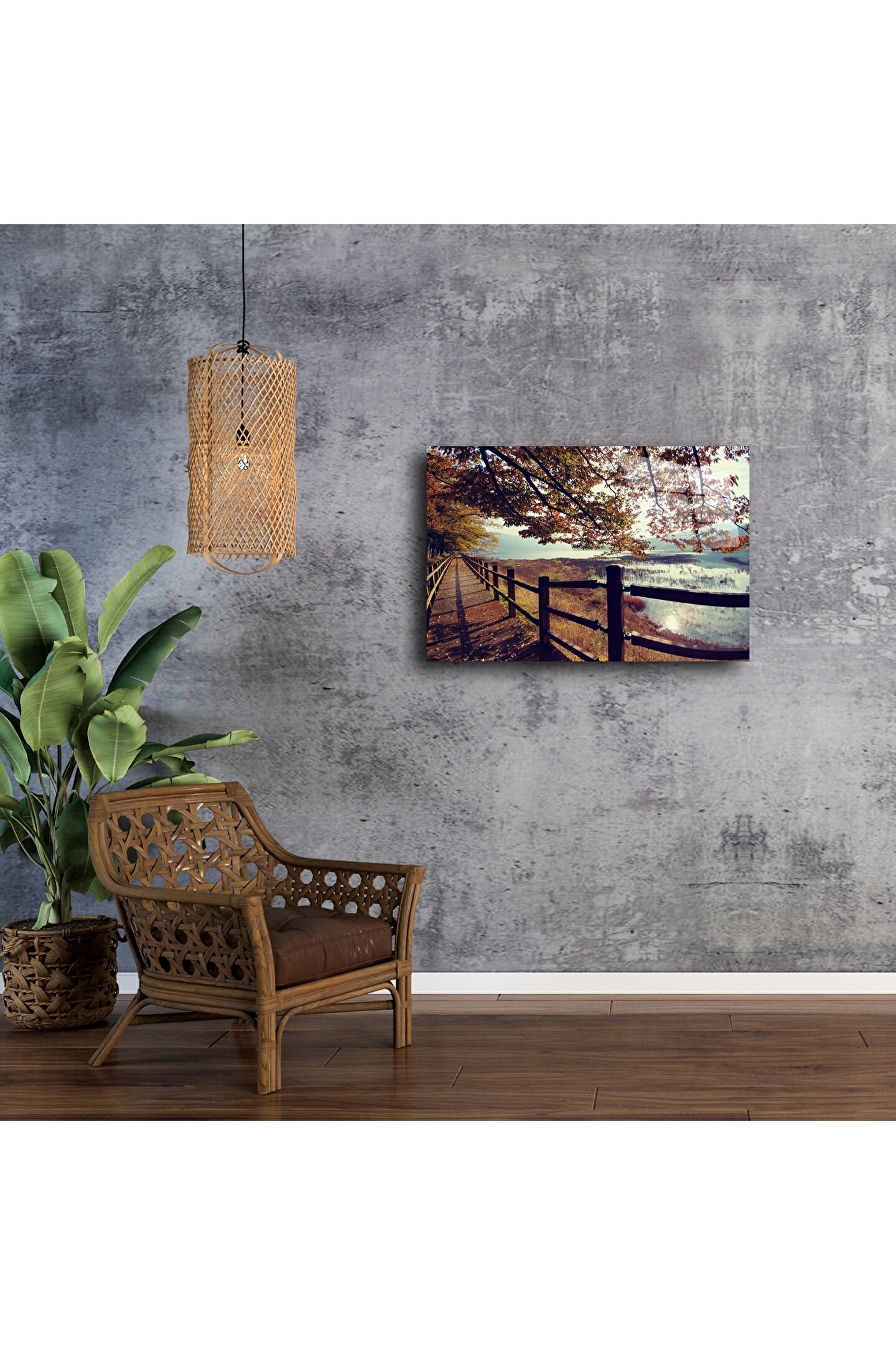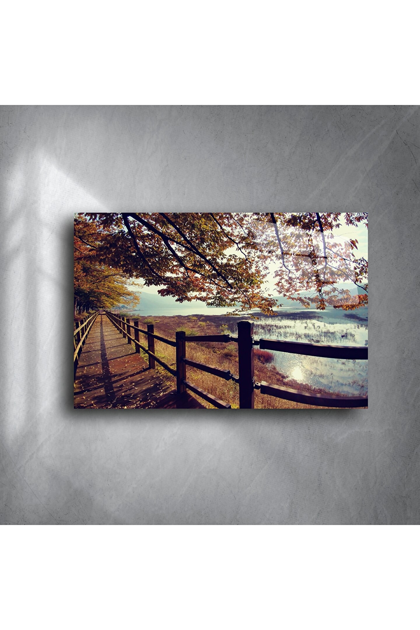 Cam Duvar Sanatı Doğal Yürüyüş Yolu Paneli, iç huzur ve doğa sevgisini yaşam alanınıza taşıyan büyüleyici bir sanat eseridir. Işıltılı göl yansımaları, yaprak döken ağaçlar ve sonsuza uzanan ahşap yolun birleşimi, bu tabloya derin bir dinginlik ve romantizm kazandırıyor.