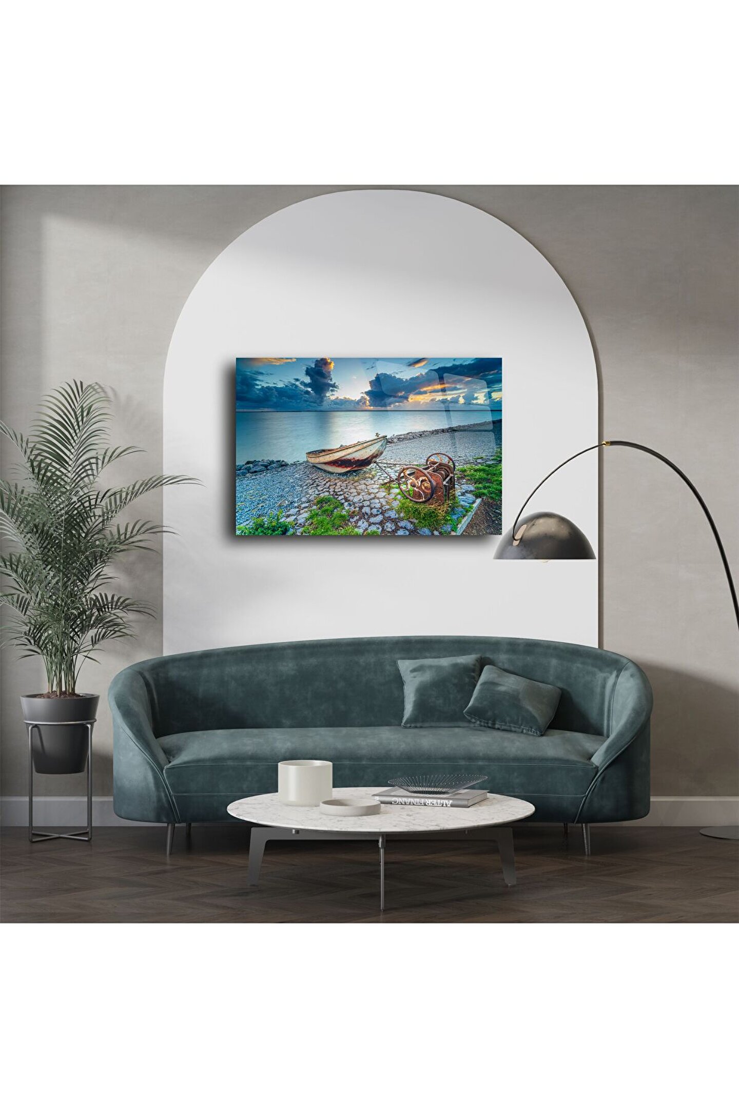Doğanın huzur verici tonlarını yansıtan bu çarpıcı cam tablo, paslanmış kayık ve gökyüzünü delen bulutlarla dolu dramatik bir günbatımını gözler önüne seriyor. Kristal netliğindeki temperli cam yüzey üzerine yüksek çözünürlükte basılan bu eser, modern yaşam alanlarına sofistike bir karakter katar. Kayalık sahil, nostaljik zincir ve sanatsal dokunuşlarla birleşerek duvarınıza adeta bir hikâye fısıldar.