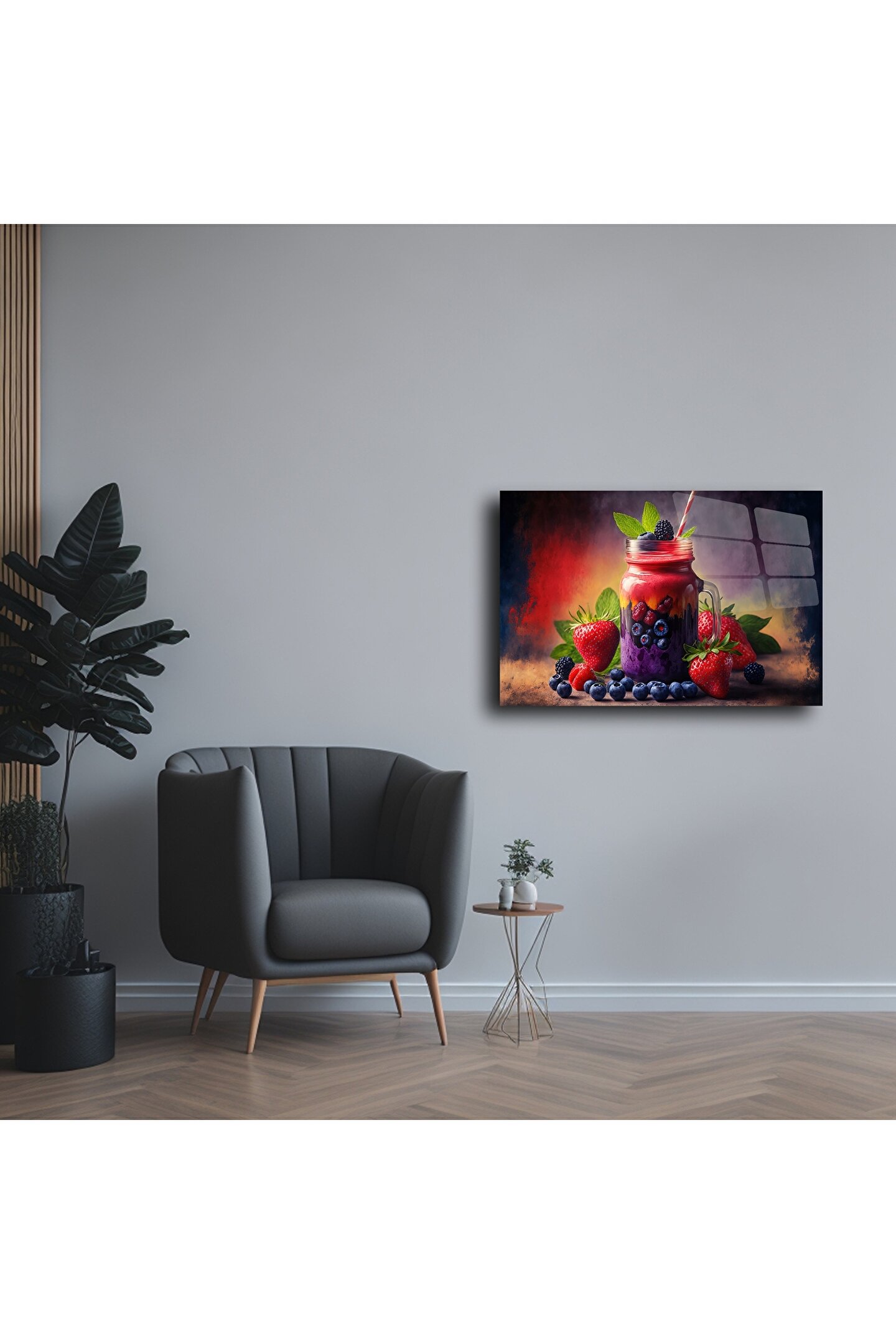 Taze orman meyveleri ve sağlıklı smoothie içeceğinin birleştiği bu canlı Cam Tablo, mutfağınıza ya da yemek alanınıza enerji katacak. Parlak ve detaylı görsel, yüksek kaliteli temperli cam üzerine basılmıştır ve renklerin canlılığıyla dikkat çeker.