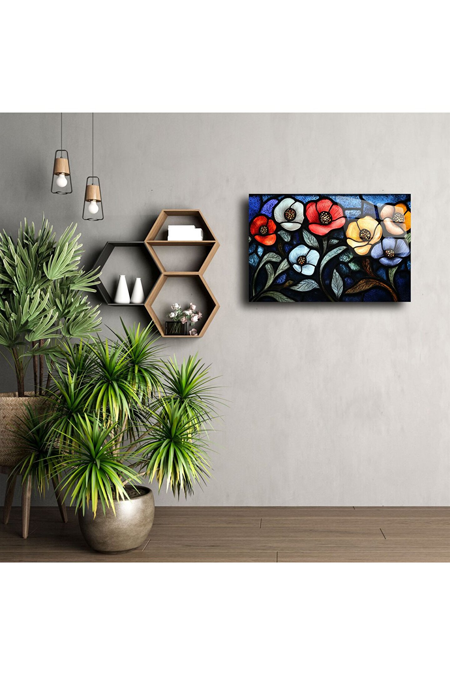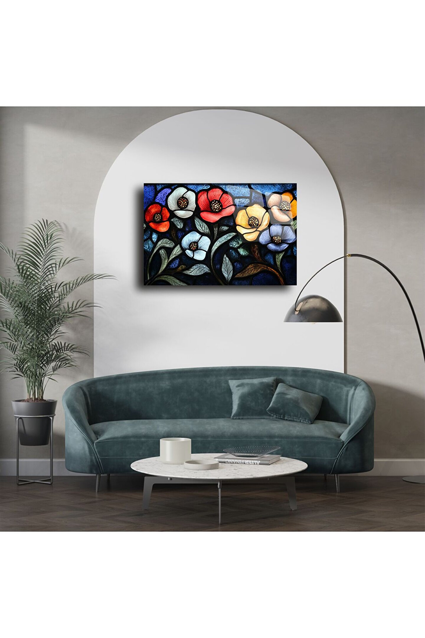 Derin mavi arka plan üzerine işlenmiş bu vitray tarzı cam tablo, canlı çiçek motifleriyle evinize benzersiz bir sanatsal dokunuş kazandırır. Her bir detay, renk ve ışık oyunlarıyla ortamınıza ruh katar.