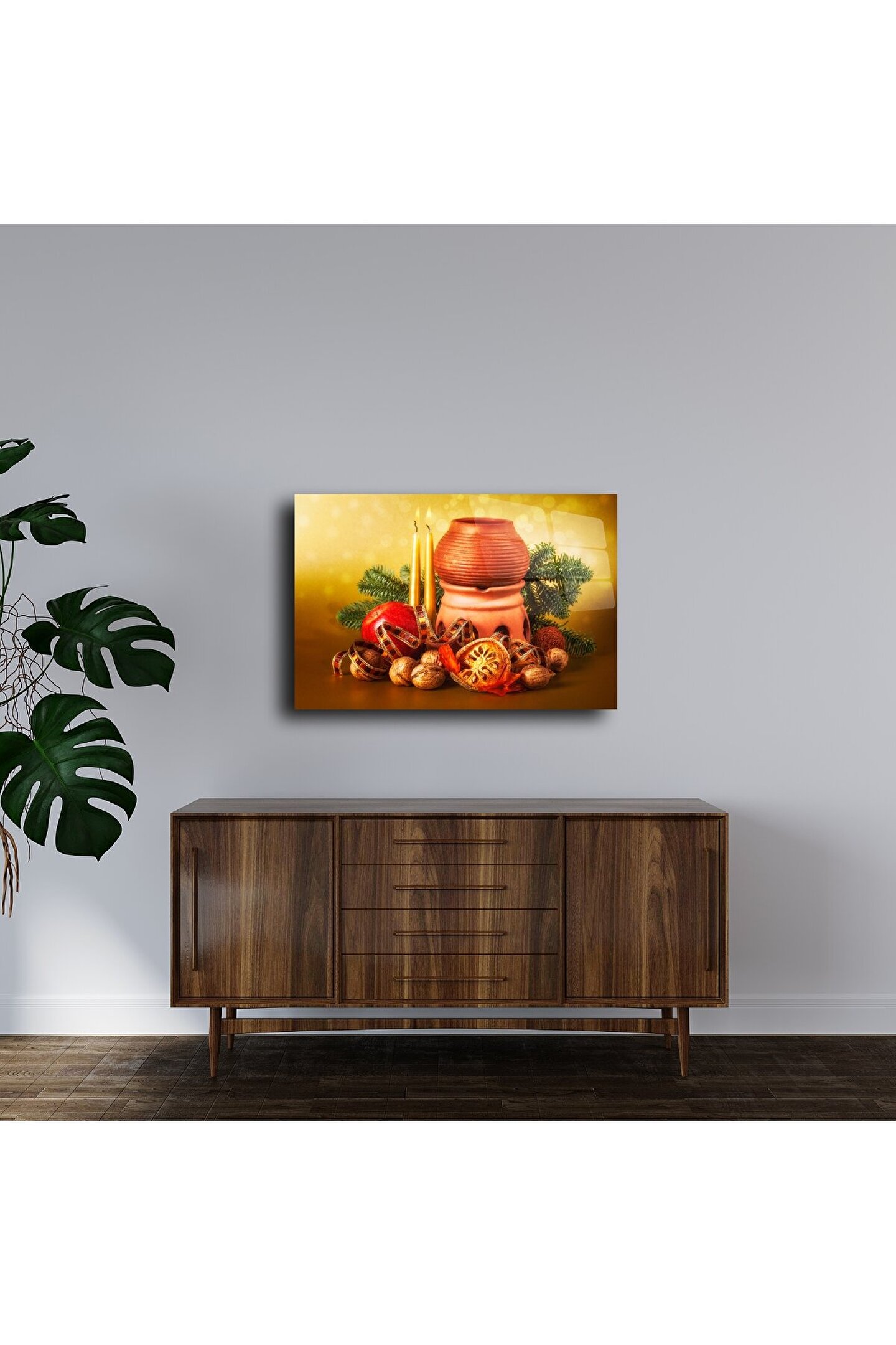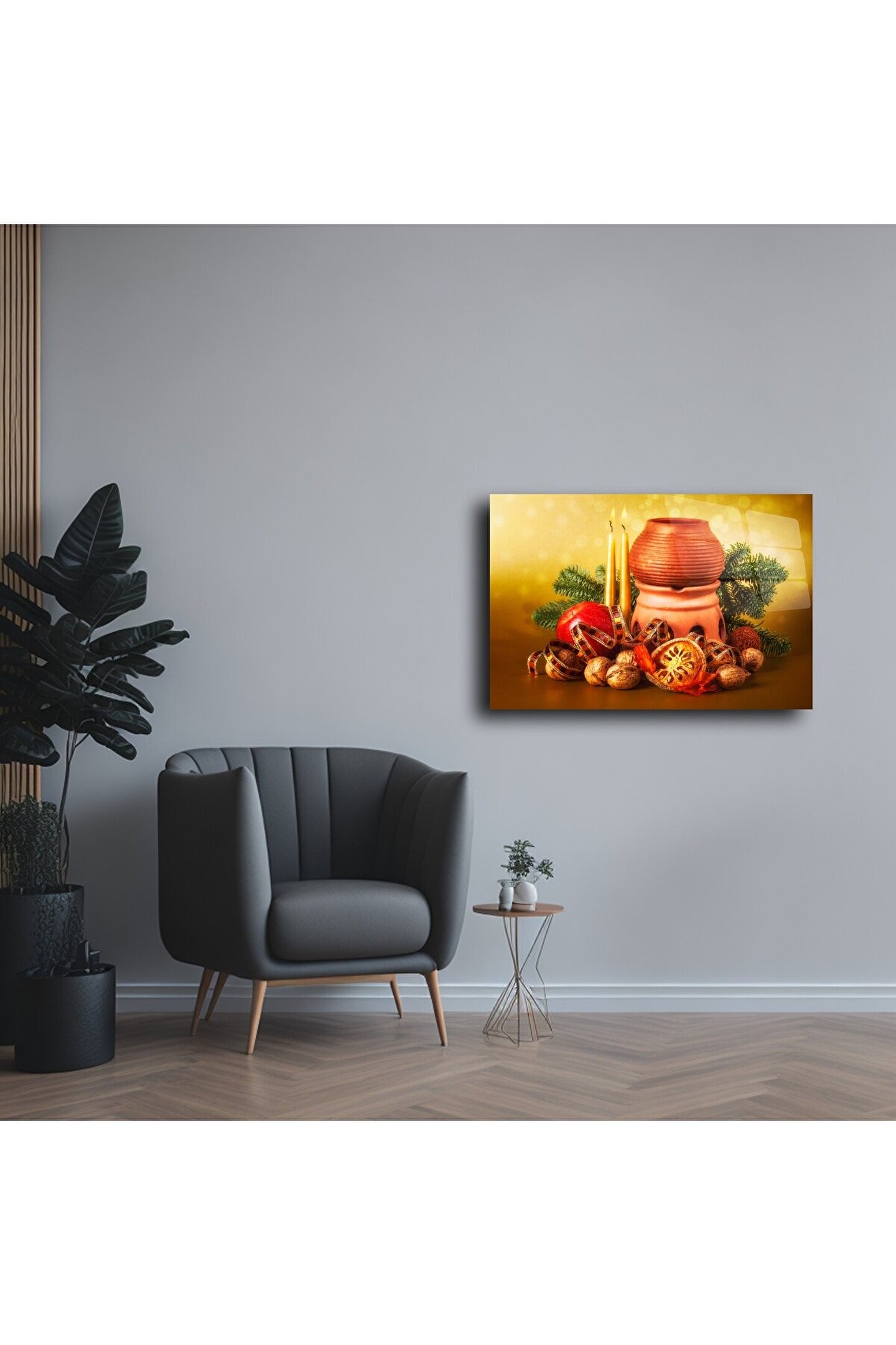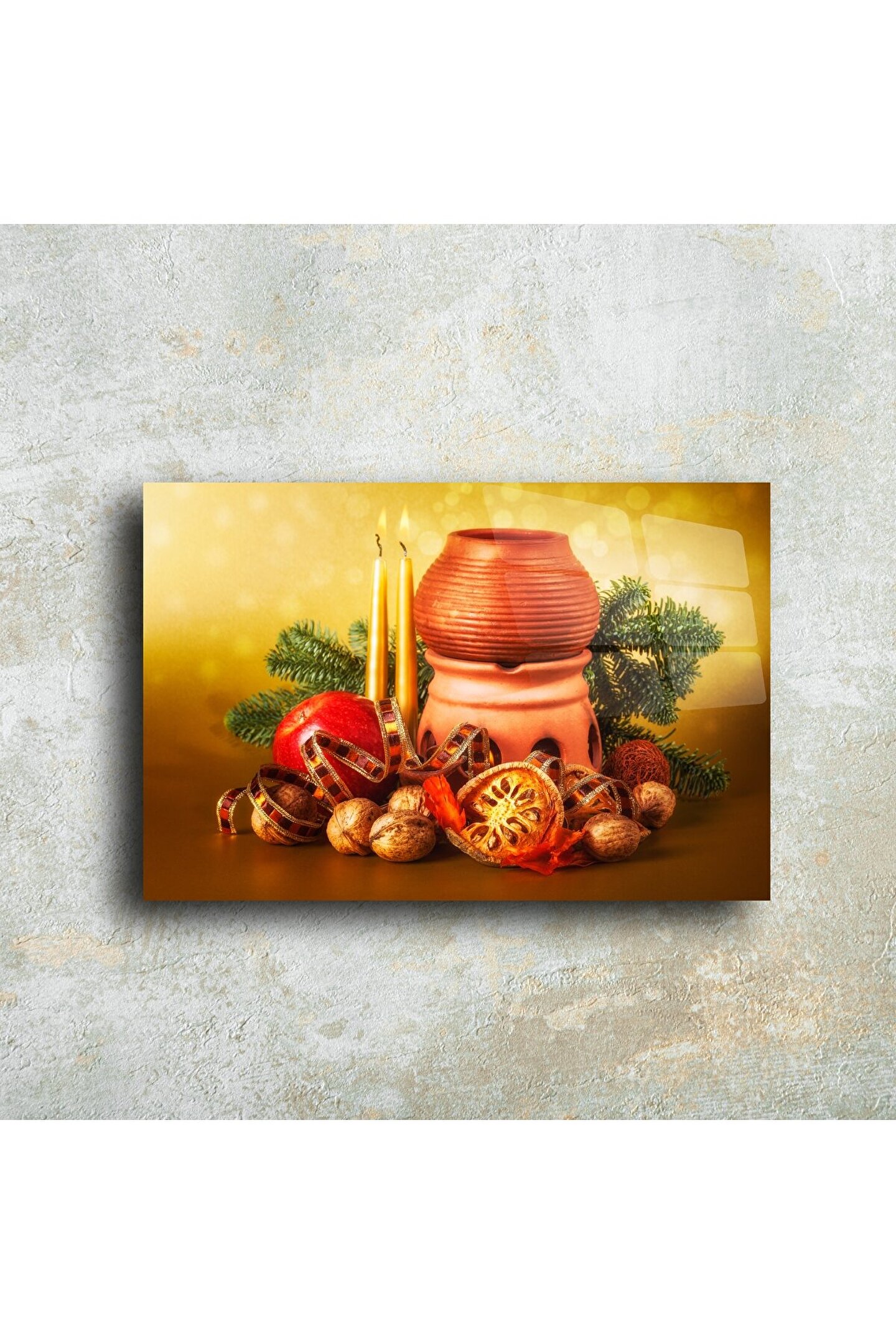 Kışın sıcak ruhunu ve yılbaşı neşesini evinize taşıyan bu Cam Tablo, mum ışığı, nar, ceviz ve tarçın detaylarıyla görsel bir şölen sunuyor. Parlak temperli cam yüzeyiyle ışığı büyüleyici şekilde yansıtırken, altın ve bakır tonlar ortama nostaljik bir sıcaklık katar.