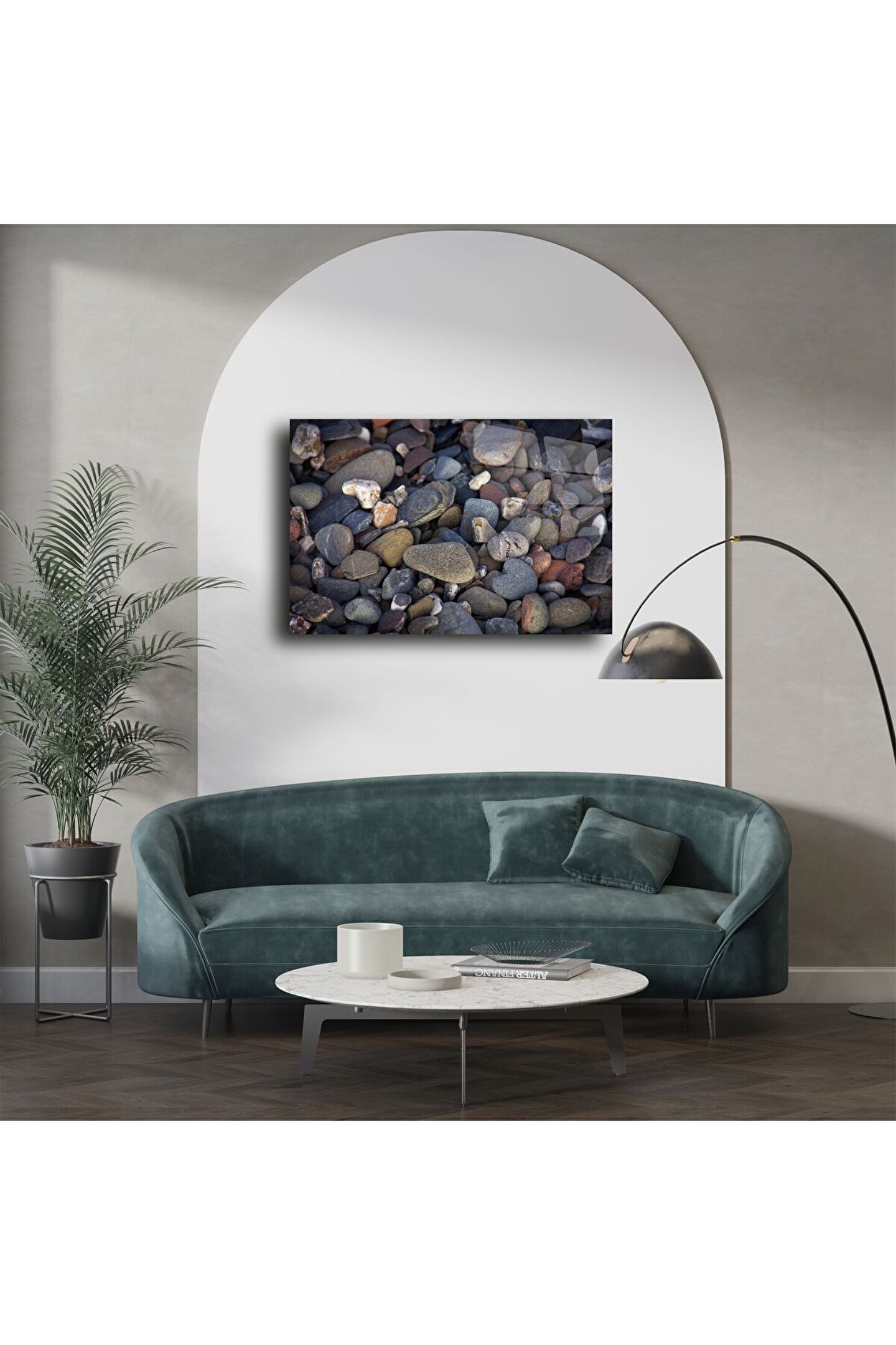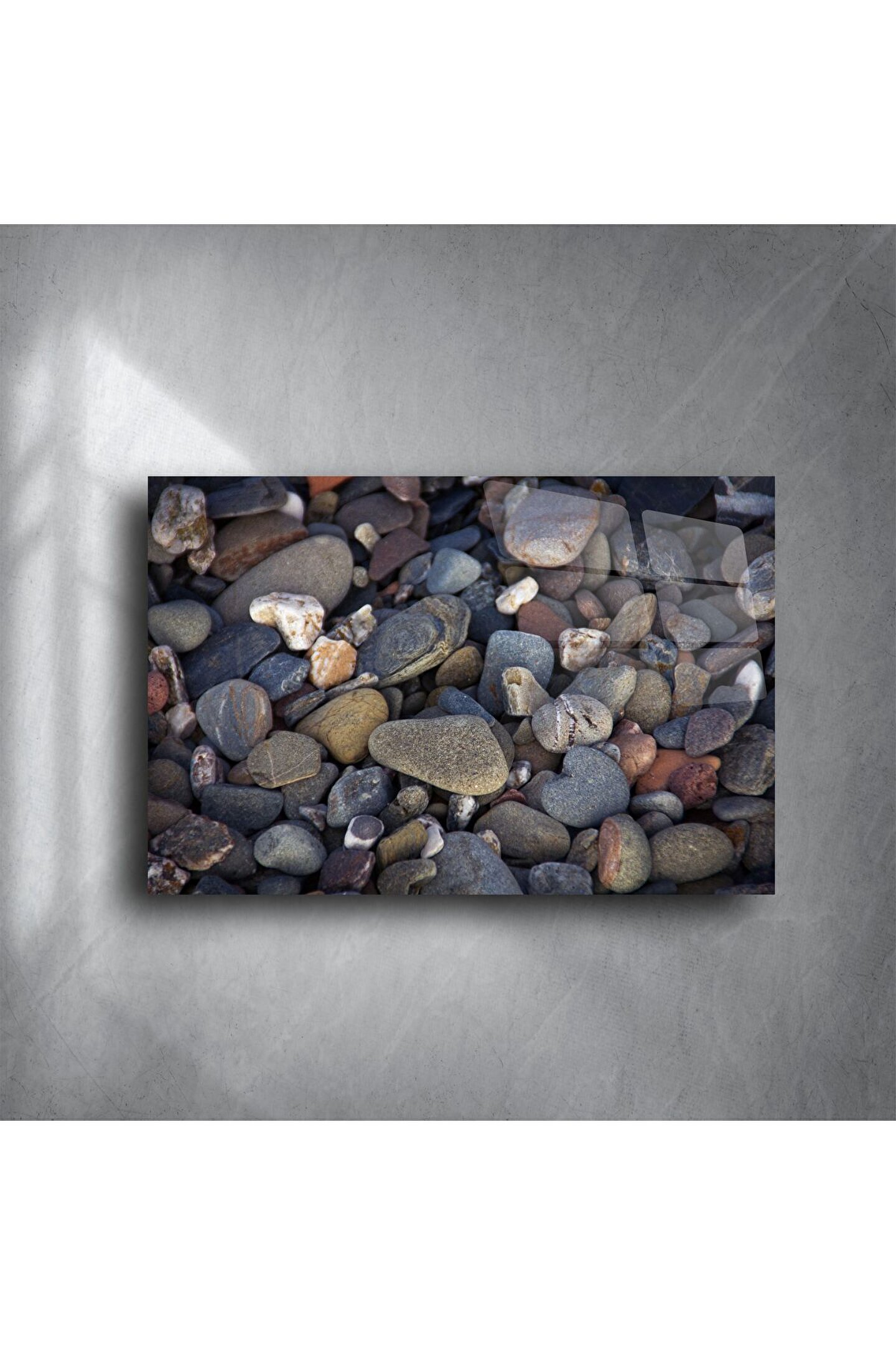Bu koyu renkli çakıl taşı desenli cam tablo, doğal dengenin ve içsel huzurun modern cam estetiğiyle birleştiği özgün bir sanat eseridir. Toprak tonlarının baskın olduğu bu görsel, odanıza sakinlik, derinlik ve doğallık katar. Yüksek çözünürlüklü taş dokusu, temperli cam yüzeyde etkileyici bir kontrastla hayat bulur.