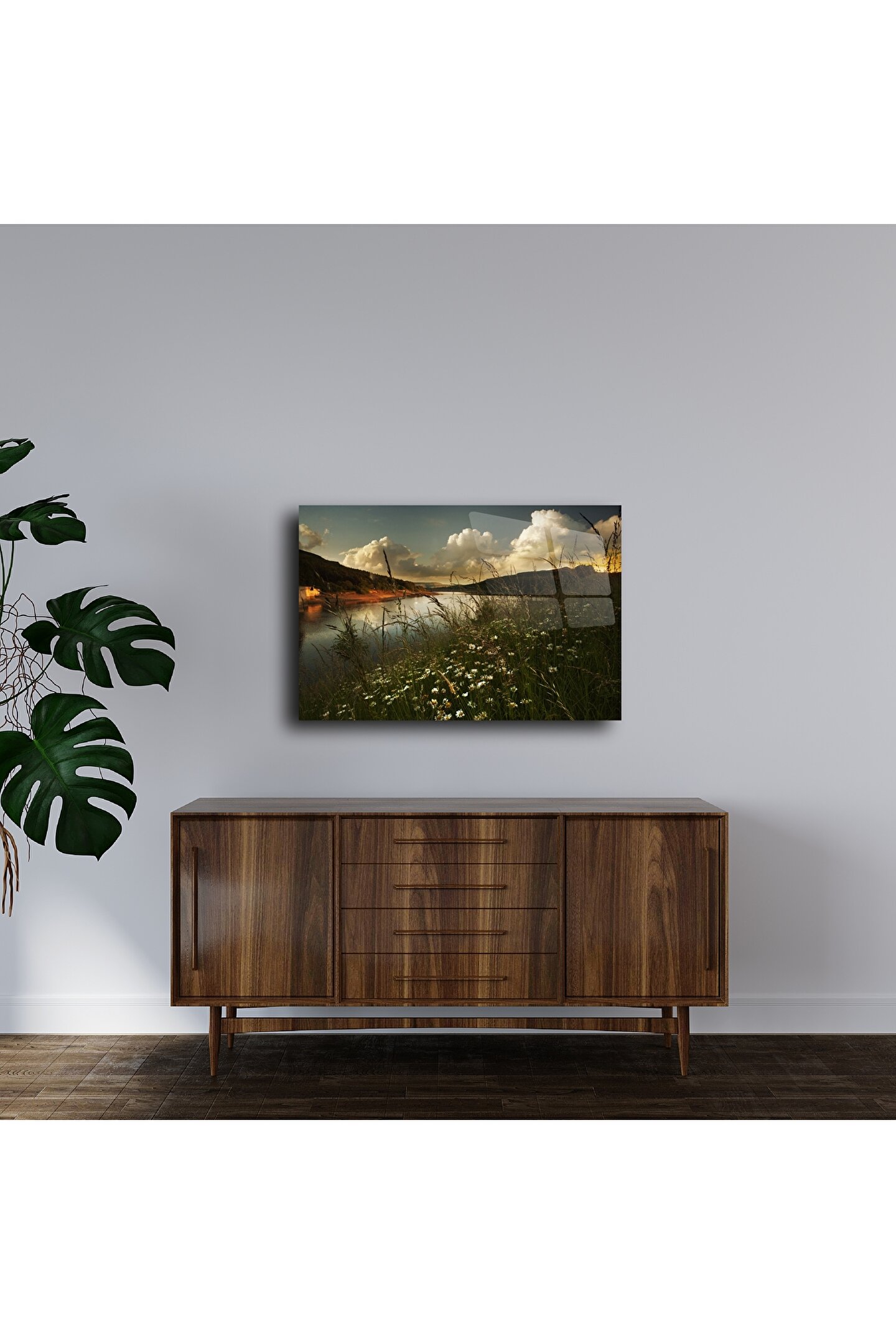 Gün batımında bir göl kenarına eşlik eden papatyaların huzur veren doğallığı bu cam tabloda hayat buluyor. Yüksek kaliteli fotoğraf baskısı ve parlak cam yüzey ile mekanınıza derinlik ve dinginlik katacak zamansız bir duvar sanatı.