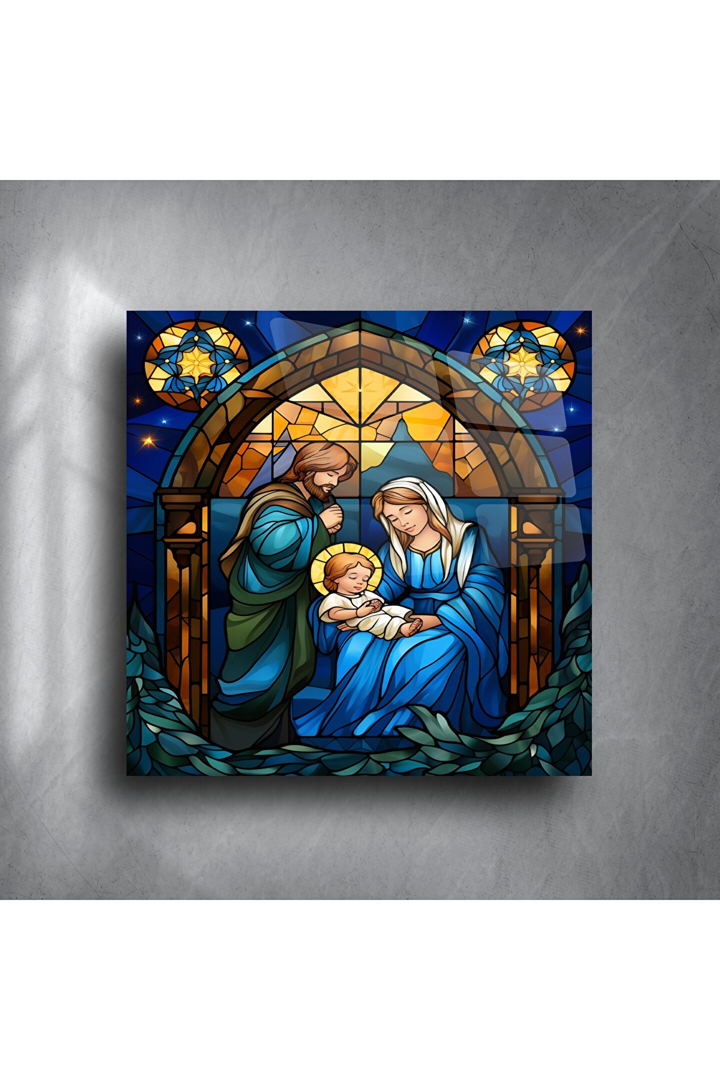 El yapımı Aziz Aile vitray tablomuz, geleneksel doğum sahnesine ruhani bir ışıltı katıyor. Derin mavi tonlarla çevrelenmiş bu sanat eseri, saf sevginin ve huzurun evinizde vücut bulmuş hali.