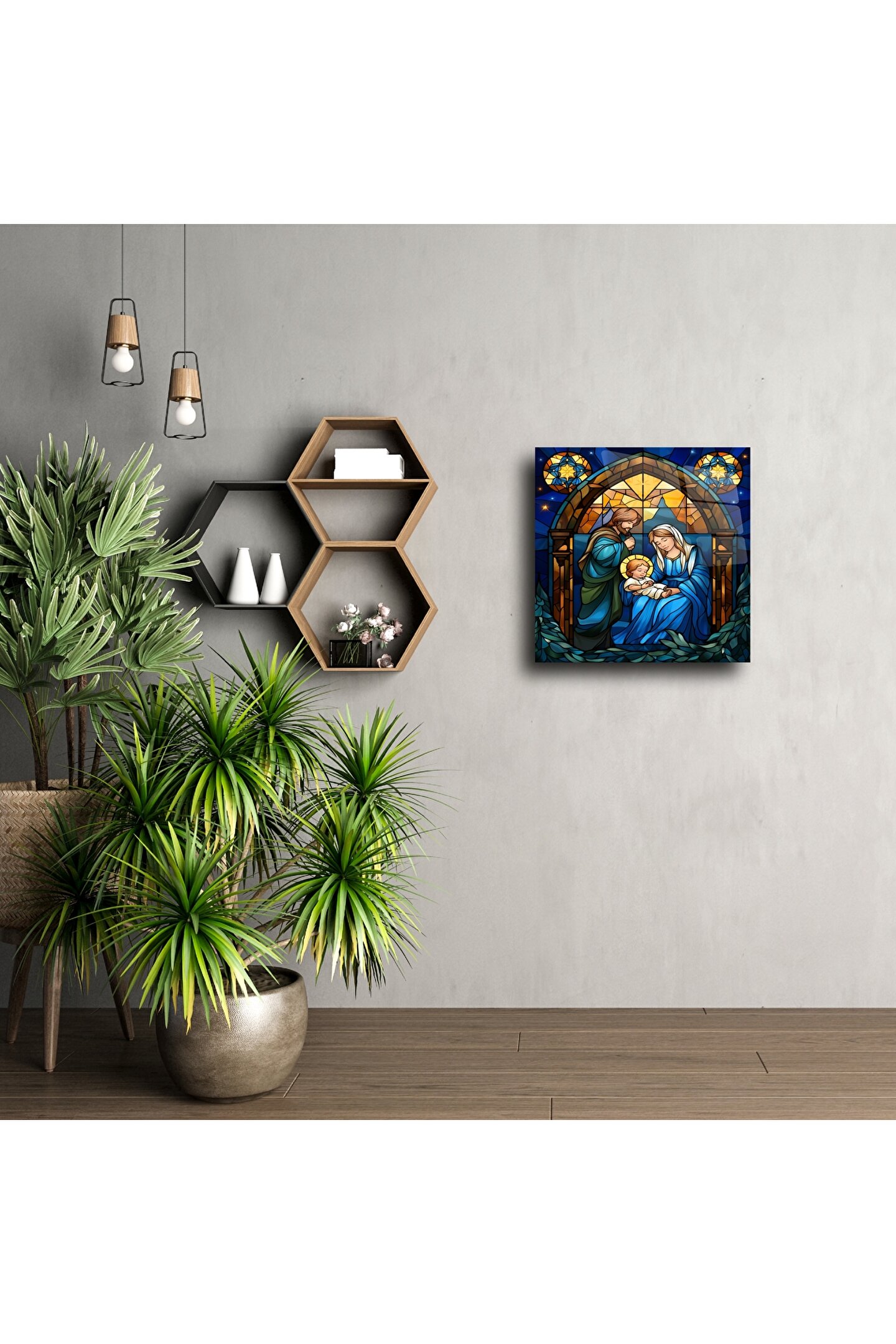 Bu zarif cam sanatında, özenle seçilmiş renkli camlar kullanılarak her bir detay sevgiyle oluşturuldu. Kutsal Aile'nin sıcaklığı, zarafeti ve inancı bu eserde güçlü bir şekilde hissediliyor — manevi derinlik arayan her dekor için benzersiz bir seçim.