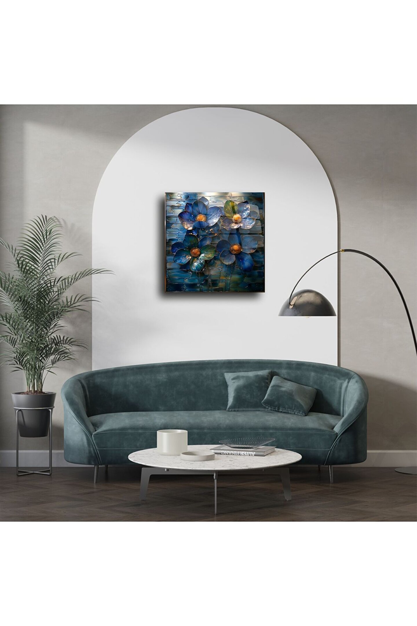 Bu el yapımı cam mozaik çiçek tablo, zarif mavi tonları ve 3 boyutlu tasarımıyla duvarlarınıza modern ve sofistike bir hava katıyor. Her bir çiçek, özenle işlenmiş cam parçalarıyla oluşturulmuş olup, gün ışığında ışıltı kazanarak bulunduğu alana canlılık ve derinlik katar.
