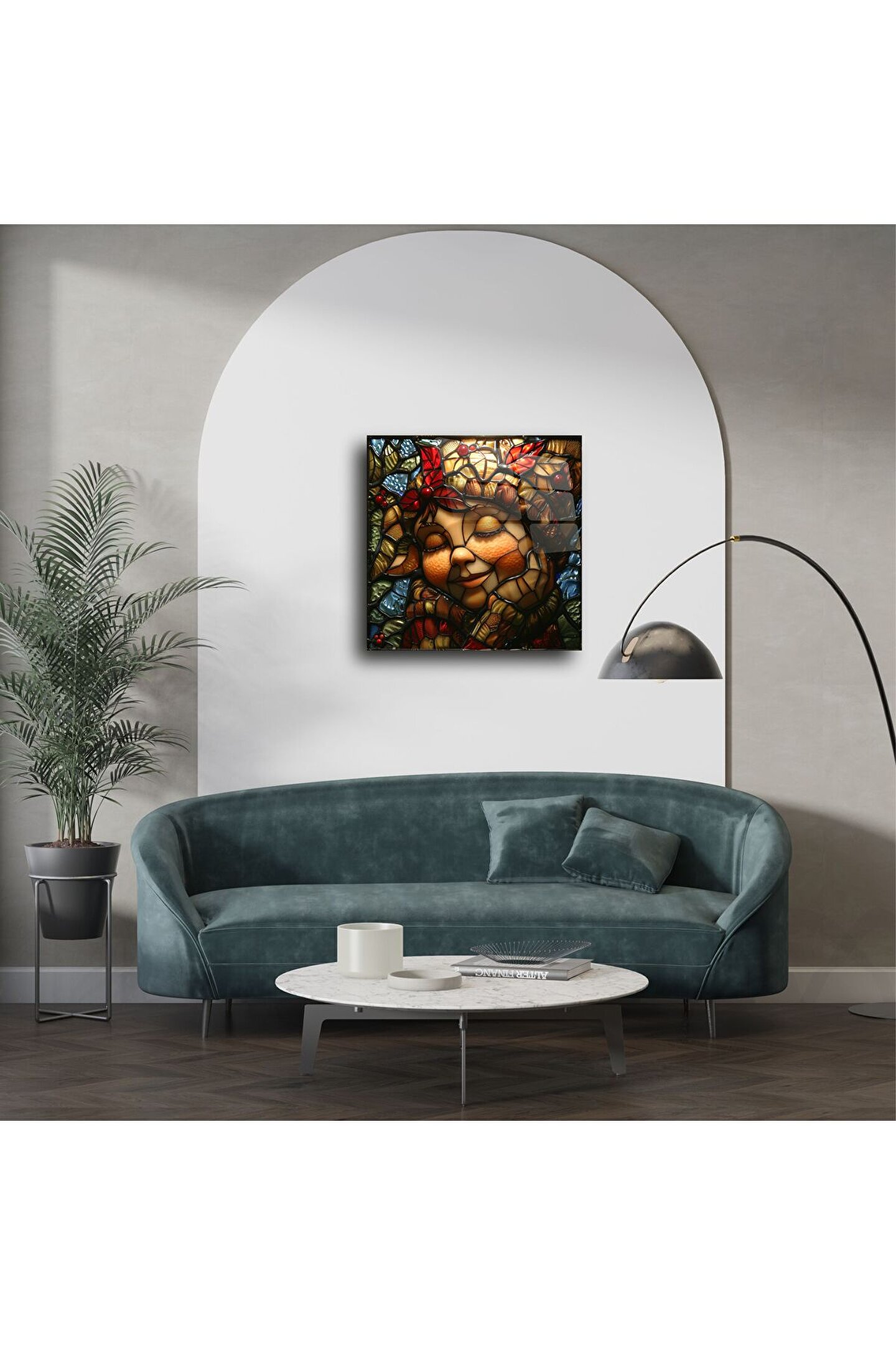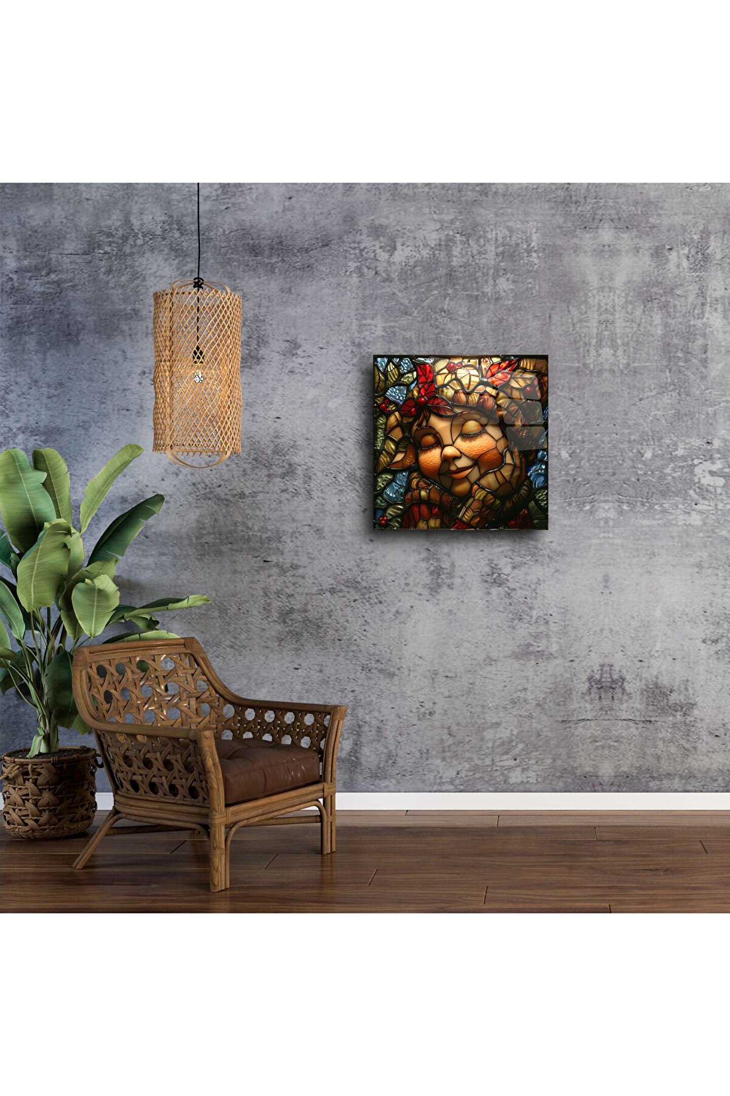 Mekânınıza sıcaklık ve masumiyet getirin — bu el yapımı vitray panel, huzur içinde uyuyan bir çocuğun yüzünü canlandırırken, çevresini sonbaharın canlı yaprakları ve zengin dokular süsler. Her bir detay, yüksek kaliteli camla işlenmiş olup duyguyu ve mevsimsel güzelliği yansıtarak sizi sakin ve huzurlu bir ana davet eder.