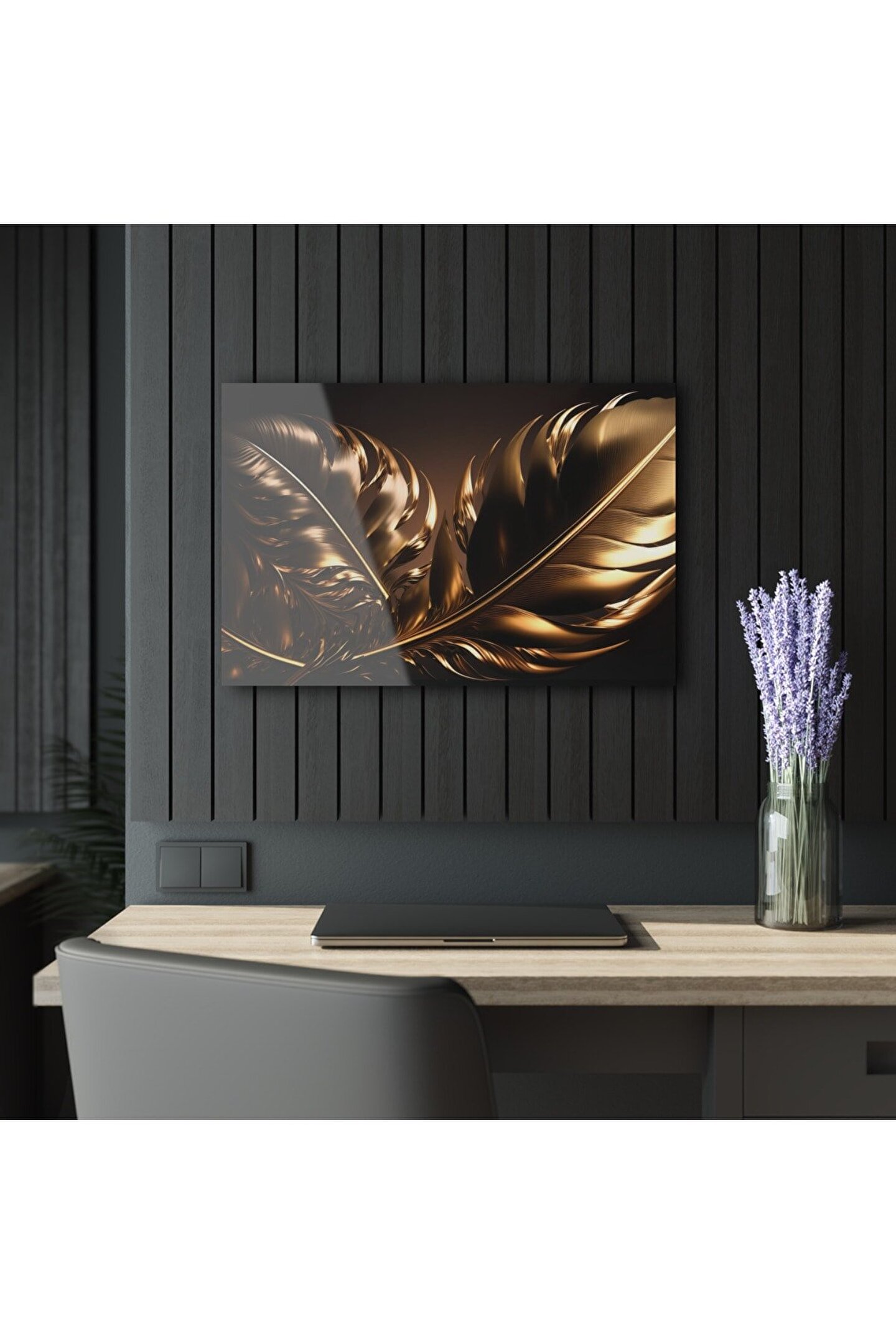 LEYLASER Gold Altın Renkli Yapraklar Cam Tablo Duvar Dekoru