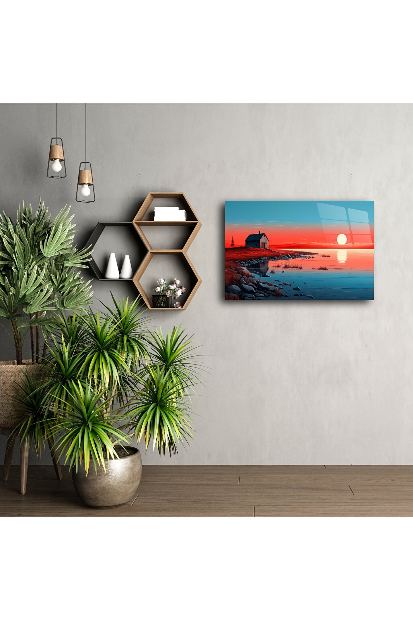 "Sunset lakehouse wall art" aramasında öne çıkan bu minimalist cam tablo, gün batımının huzurunu evinize getirir. Canlı kırmızı ve sakin mavi tonlarıyla izleyene dinginlik sunar, modern çizgileriyle her yaşam alanına zarafet katar.
