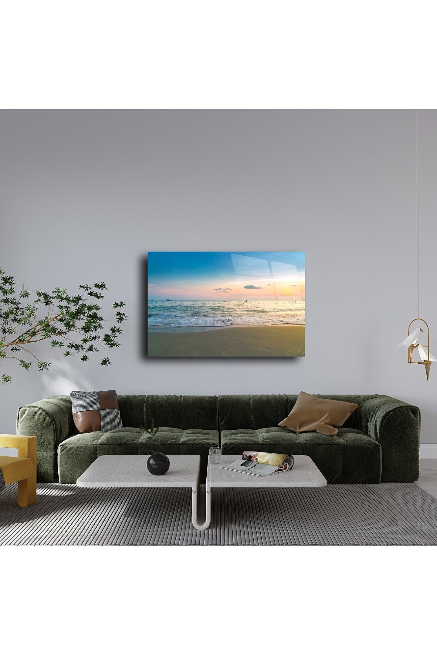 Gün batımının huzur veren renkleriyle bütünleşen bu yüksek çözünürlüklü cam tablo, sahil manzarasının zarafetini yaşam alanınıza taşır. Şeffaf cam yüzeyi, denizin dalgalarını ve gökyüzünün pastel tonlarını büyüleyici bir derinlikle yansıtır. Bu modern sahil cam tablosu, evinizde sakinlik ve ferahlık hissi uyandırır – tıpkı gün batımında kıyıda yürüyormuş gibi.