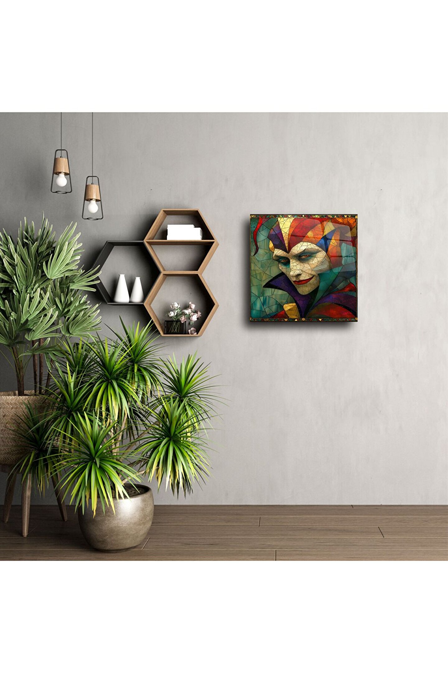 Dikkat çekici ve sıradışı bu joker maskeli cam tablo, gotik estetikle renklerin çarpıcı buluştuğu sanatsal bir dekor parçası sunuyor. Kırılgan vitray efekti ve gizemli bakışlar, her ortamda derin bir atmosfer yaratıyor.