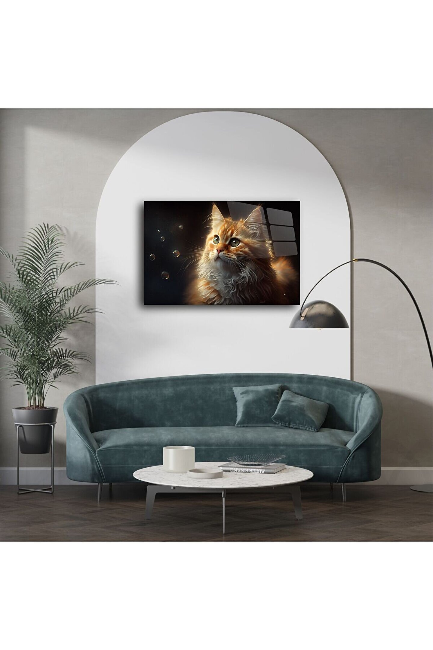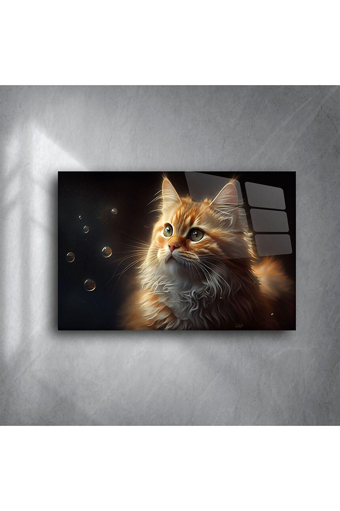 Hayal gücünü harekete geçiren bir bakış... Bu kabarcıklara bakan turuncu kedi cam tablo, estetikle masumiyeti buluşturuyor. Yumuşak ışık efektleri ve detaylı kürk dokusu, yüksek kaliteli temperli camüzerinde derin ve gerçekçi bir görünüm sunar.
